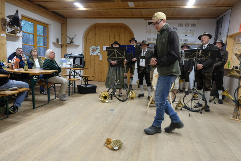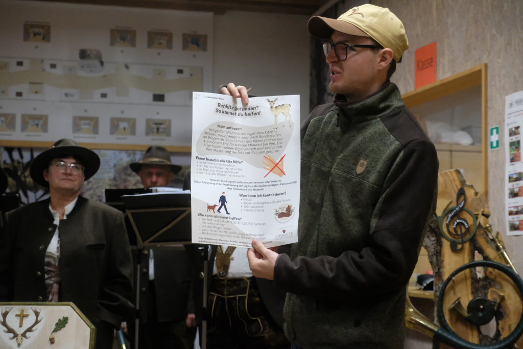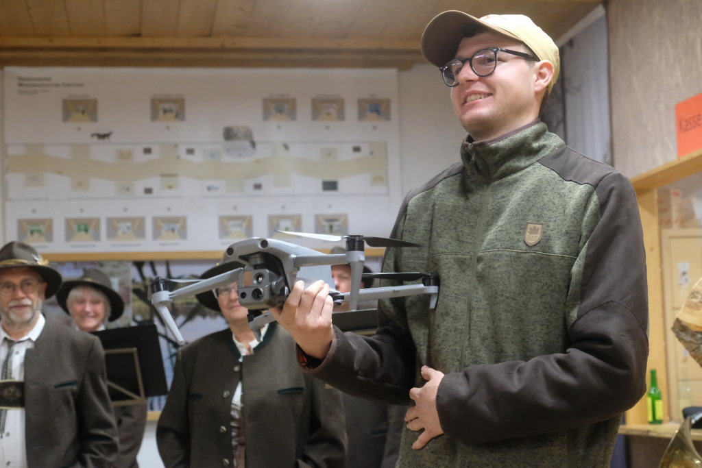 Ricardo Schorpp, der musikalische Leiter der Jagdhornbläser Bad Wurzach, freute sich, nach dem ersten Stück der Bläser den ganz besonderen Gast vorstellen zu können. Alexander Dreher, der schon sehr früh in seinem Leben mit Tieren und Tier(er)haltung in Kontakt kam, ging in seinem ersten Redebeitrag auf die inzwischen vorgeschriebene Rehkitzrettung vor einer Mahd ein. Er erläuterte, dass er und sein Team mit der heutigen Generation von Drohnen innerhalb kurzer Zeit ein relativ großes Feld abfliegen kann. Ricardo Schorpp konnte sich noch gut an die Zeit vor den Drohnen erinnern, als das Aufspüren von Rehkitzen noch eine sehr schweißtreibende Arbeit war.