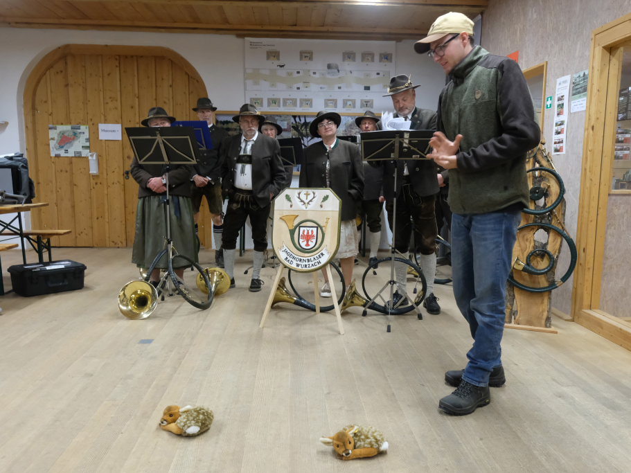 „Alexander erzählt was von Kitzen und wir spielen „Auf, auf zum fröhlichen Jagen,“ entschuldigte sich Schorpp beinahe bei den Zuhörern. Zwischendurch erklärte er den Zuhörern, dass die Jagdhornbläser das sogenannte Parforce-Horn verwenden, das normalerweise bei der berittenen Jagd verwendet wurde.