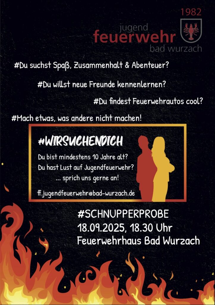 Bad Wurzach – Die Jugendfeuerwehr lädt interessierte Buben und Mädchen zu einer Schnupperprobe ein. „Kommt am 18. September um 18.30 Uhr zum Feuerwehrhaus Bad Wurzach“, schreibt Pascal Schmehl.