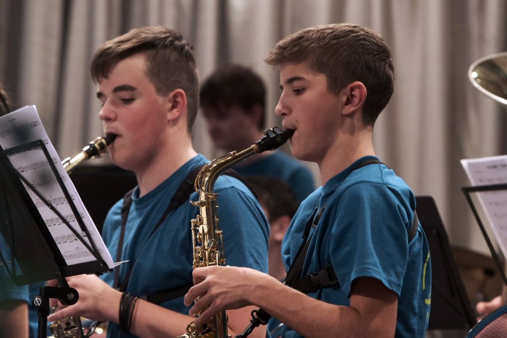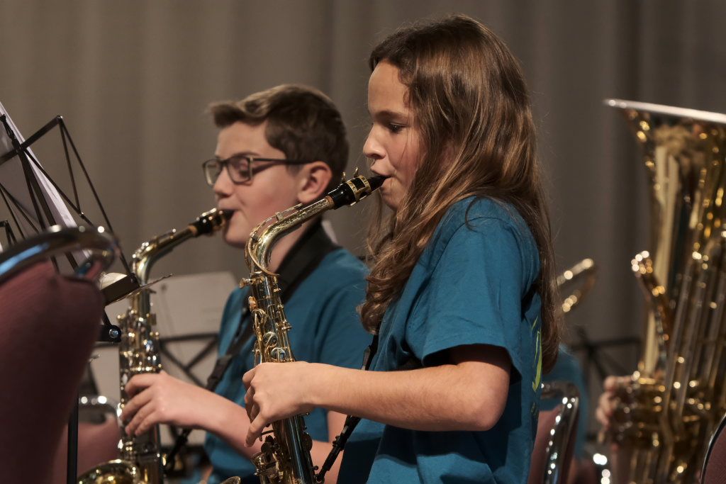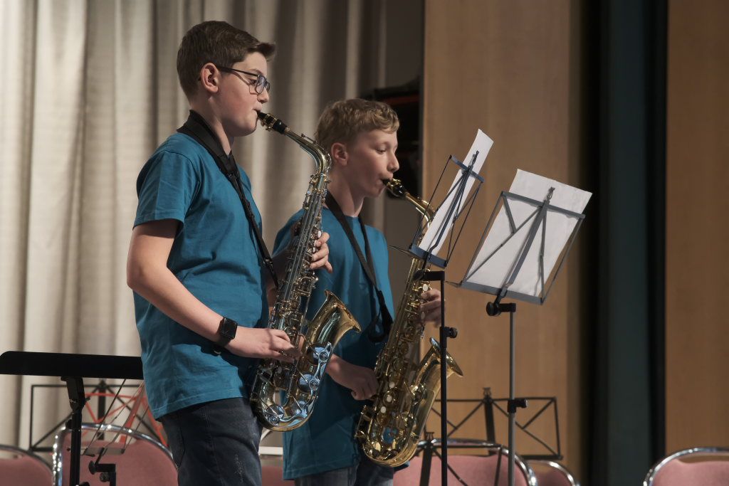 Ebenfalls mit zwei Duos trat Klarinetten- und Saxophonlehrer Georg Stankalla bei dem Konzert auf. Zunächst spielten die beiden Cousinen Leonie und Annalena Heine mit ihren Klarinetten zunächst das Traditional „Prärie Song“ und danach von A. Wandertagen das Konzert-Duett. Danach machten Florian Gieger und Eli Brik ihren Saxophonlehrer Stankalla mit dem gleichnamigen Stück von Paul Schmidt „Happy“.