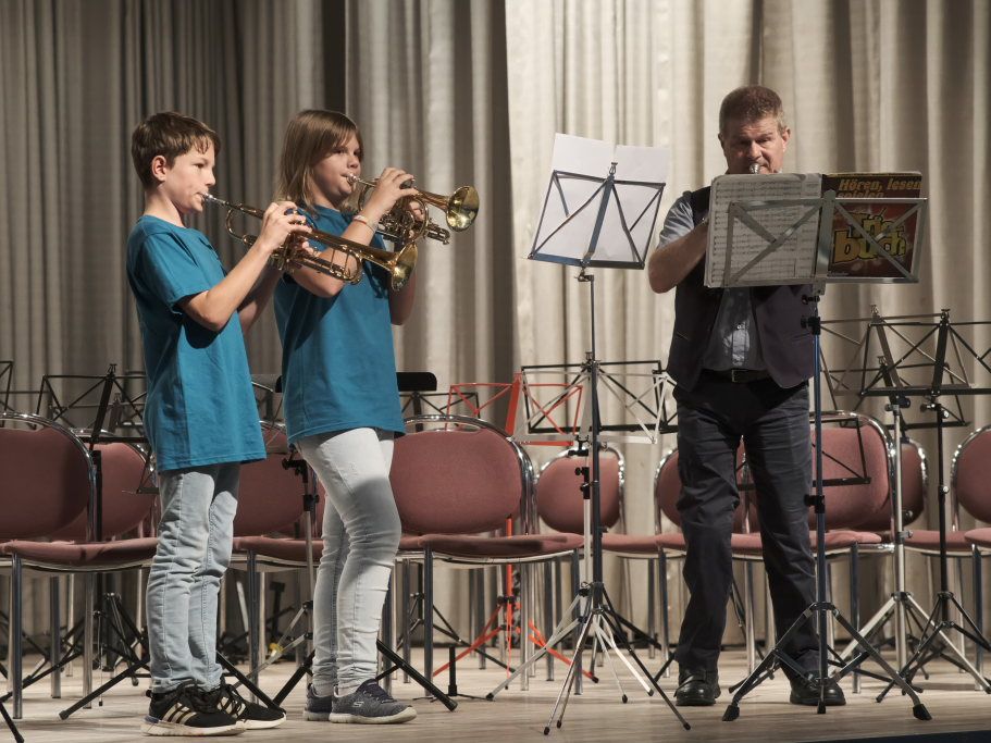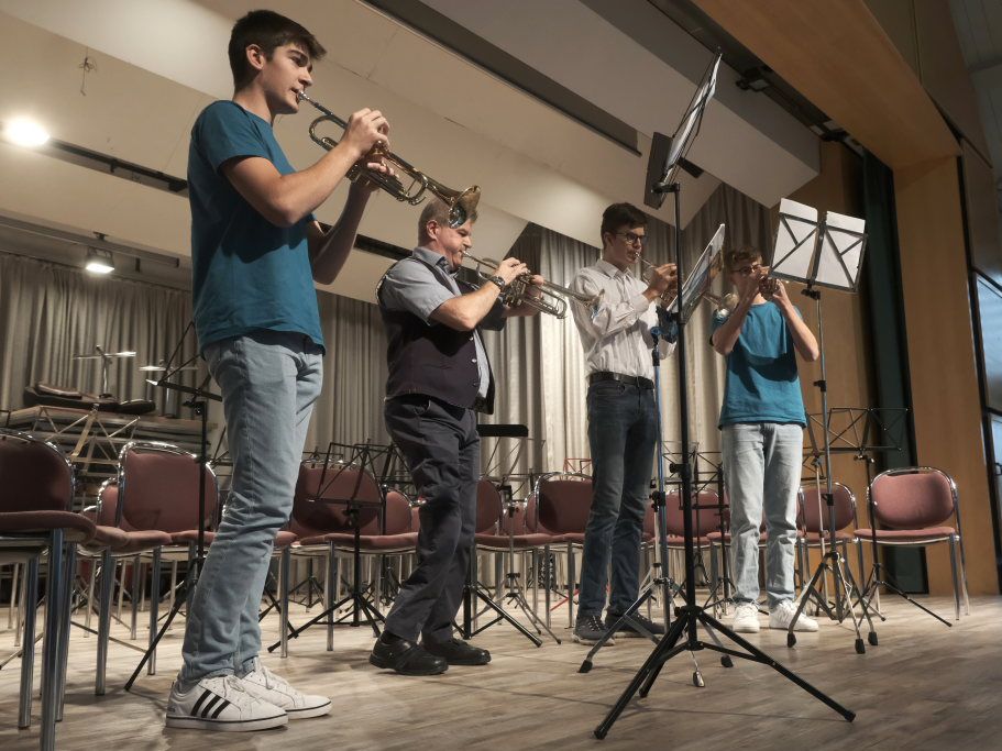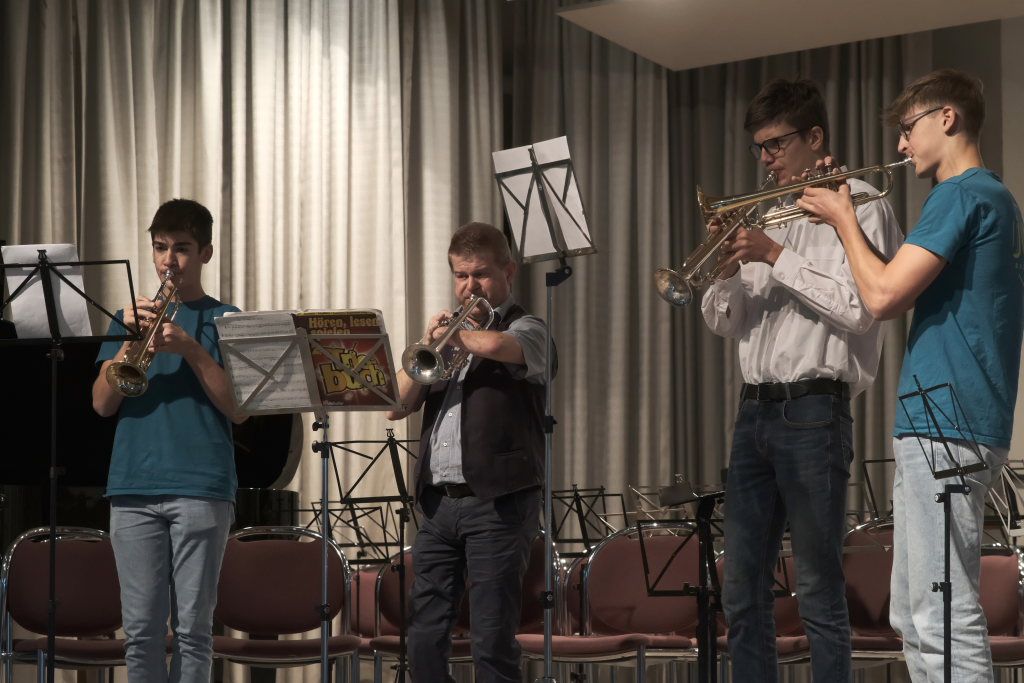 Gemeinsam mit ihrem Trompeten-Lehrer Martin Schad spielten Lena Riß und Felix Schwarz den „Mini-Rock“ von André Wagnein, den Fräulein Riß gerne im Minirock bestritten hätte, dabei aber bei ihren männlichen Mitspielern auf wenig Gegenliebe gestoßen war. Als Quartett traten Julian Riß, Andreas Kiebler und Max Schmid gemeinsam mit ihrem „Chef“ Martin Schad und dem Traditional Go down Moses an.