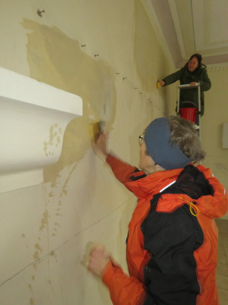 Am Samstagnachmittag, 23. März, hörte man das Wummern zweier Kompressorhämmer aus dem Inneren der Brugger Rochus-Kapelle: Erhard Gut und Klaus Ringer schlugen den schadhaften Putz ab. Was in dem denkmalgeschützten Gebäude an Mauerwerk entfernt werden durfte, hatte einige Tage zuvor Restaurator Erwin Roth (Ausnang) nach einer bauhistorischen Untersuchung angezeichnet. Das galt auch für jene Bereiche an den Wänden, an denen die mittlerweile unansehnliche Leimfarbe entfernt werden sollte; Erwin Roth hatte das Arbeitsfeld vorgegeben und ein halbes Dutzend Schaffer hatte am Morgen des 23. März sich mit Schwamm und Kübel ans Werk gemacht.