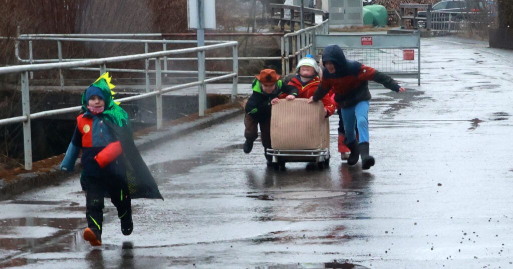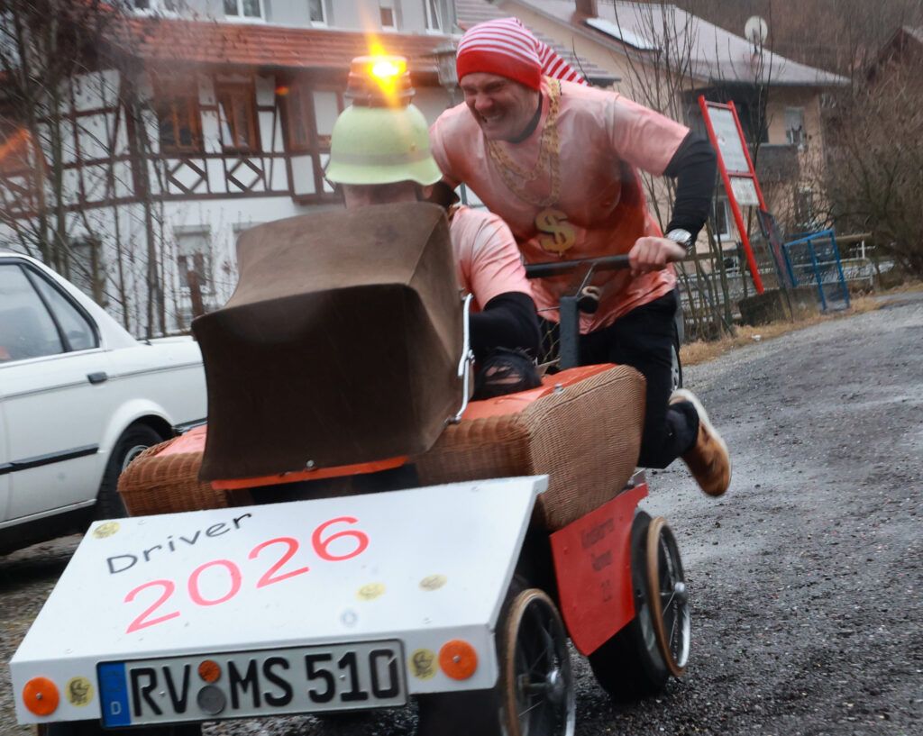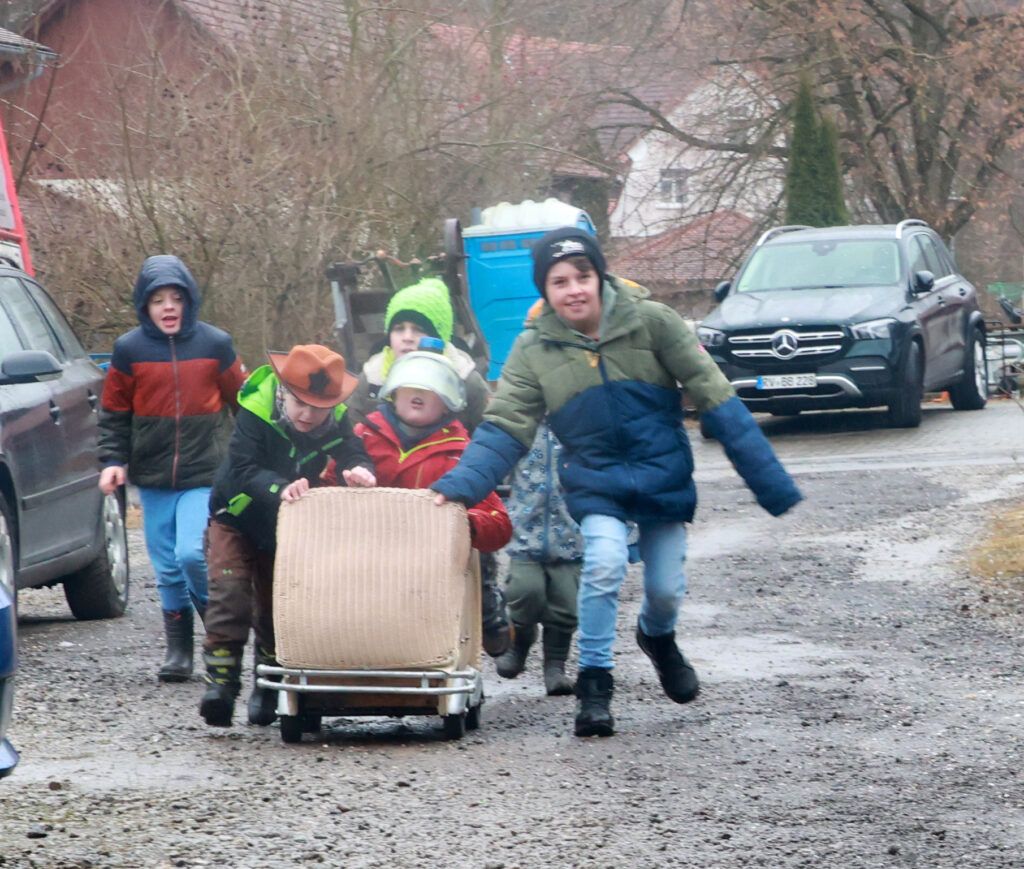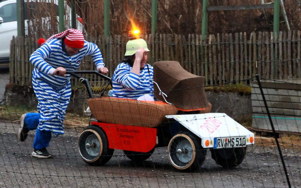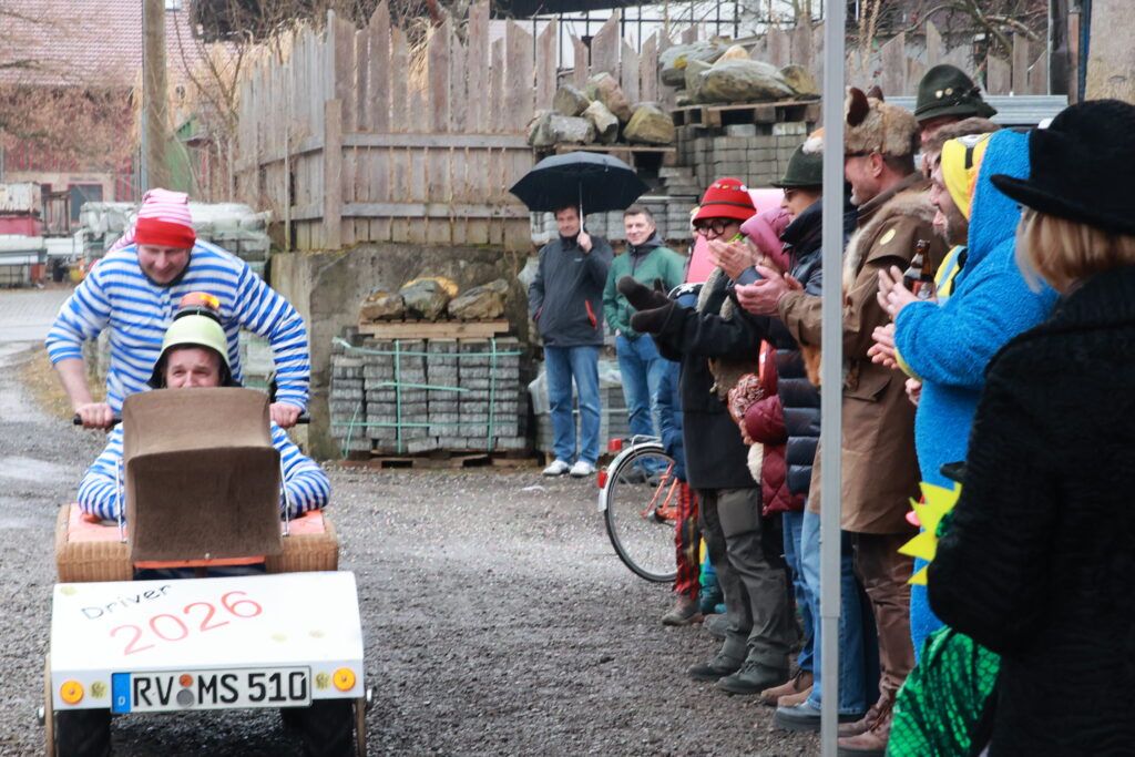 Hauerz – Normalerweise plätschert der Hauerzer Dorfbach gemächlich durch die Bachstraße. Doch an diesem Wochenende (14.2.) war Schluss mit Ruhe. Die Hauerzer Dorfgemeinschaft machte die Straße zur Rennstrecke. Beim traditionellen „Kindskarrenrennen“ rollten bunt geschmückte Kinderwägen über den Asphalt. Es waren vier Kinderteams am Start und 16 Teams von Erwachsenen. Jung und Alt feuerten begeistert an.