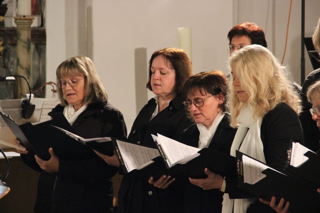 Chorsängerin Alexandra Gut (Bild; am Mikro) führte durch das Programm, das überwiegend geistlichen Charakter hatte und in dem die leisen, feinen Töne überwogen, auch wenn da und dort ein kräftiges Crescendo gewagt wurde – wie etwa beim rockigen “Viva la vida” und beim beschwingten ABBA-Song „Thank you for the music“, der als Zugabe ein zweites Mal dargeboten wurde.