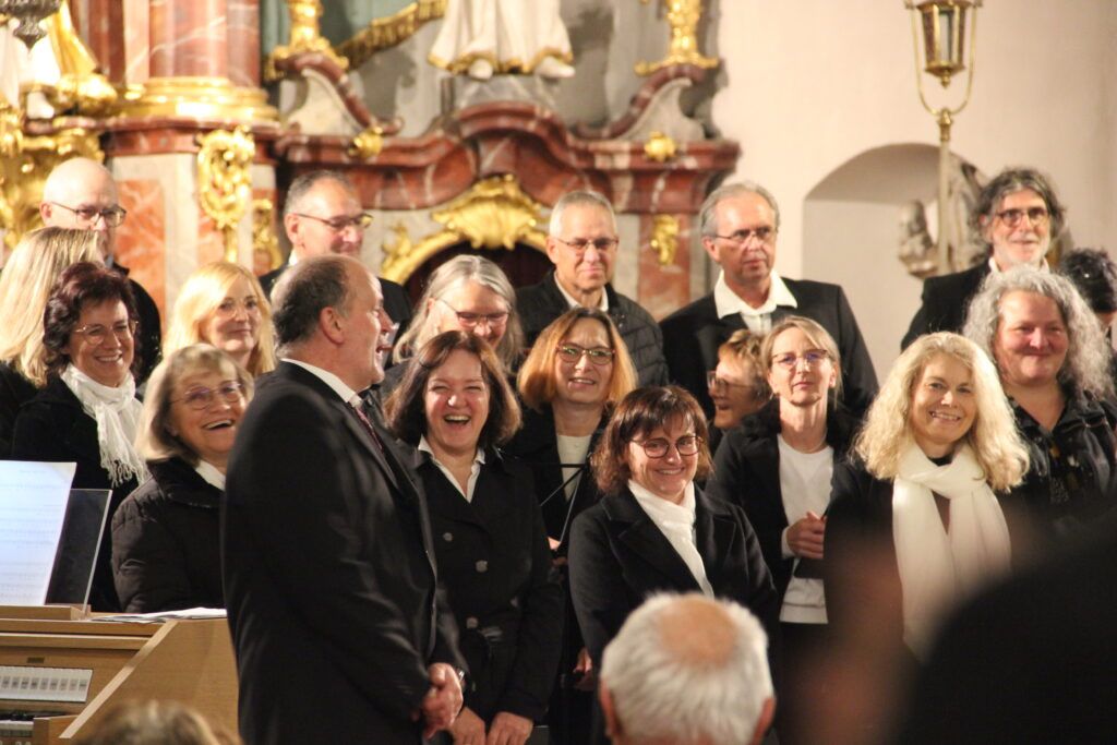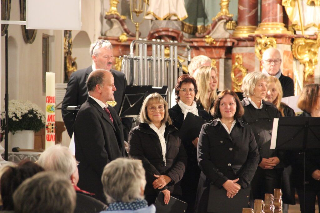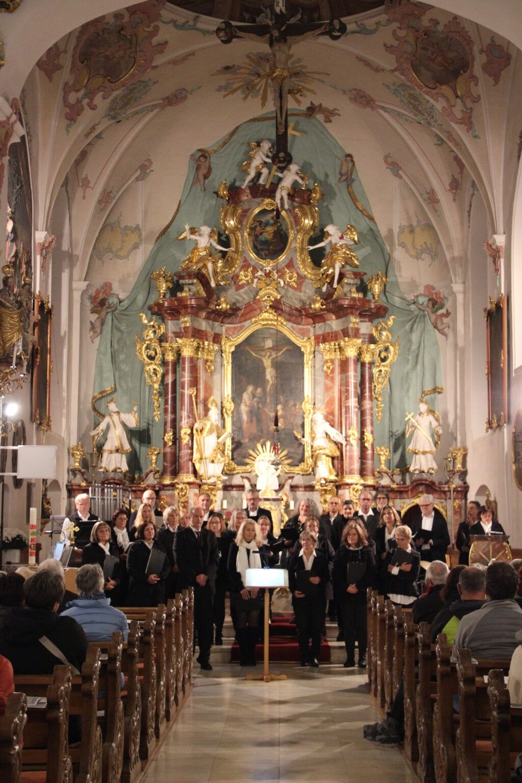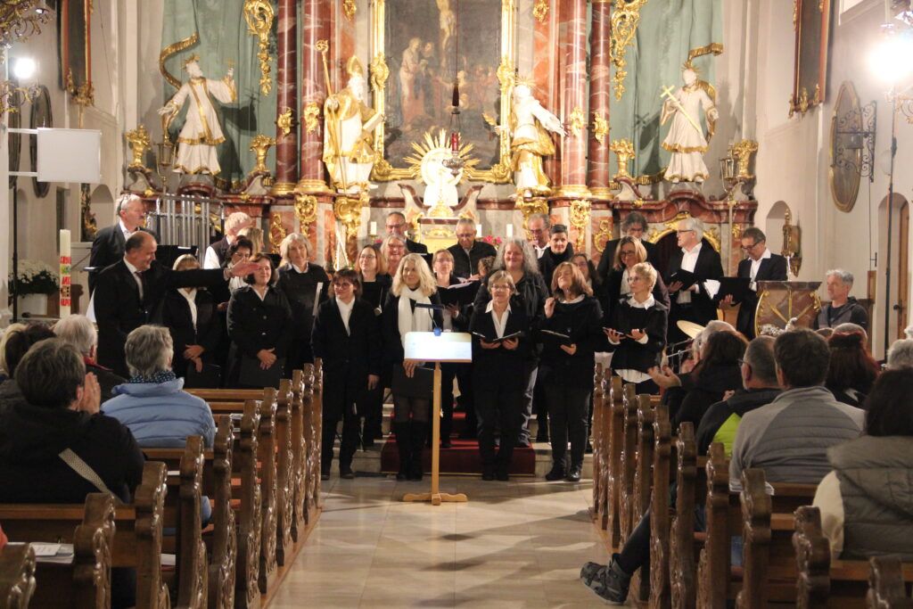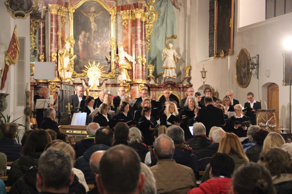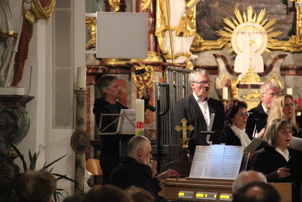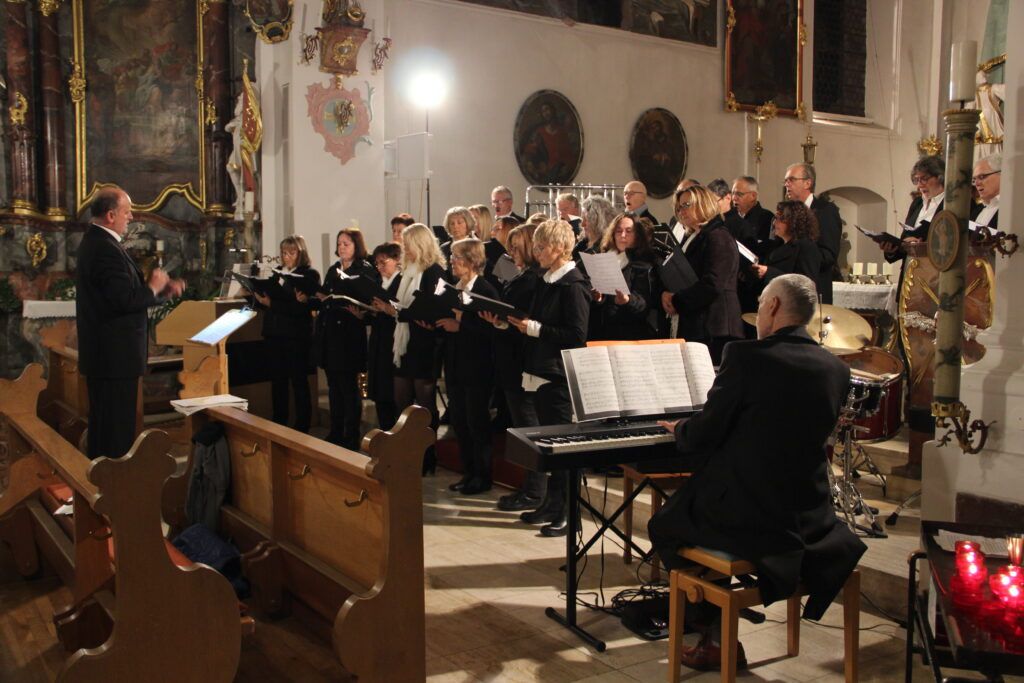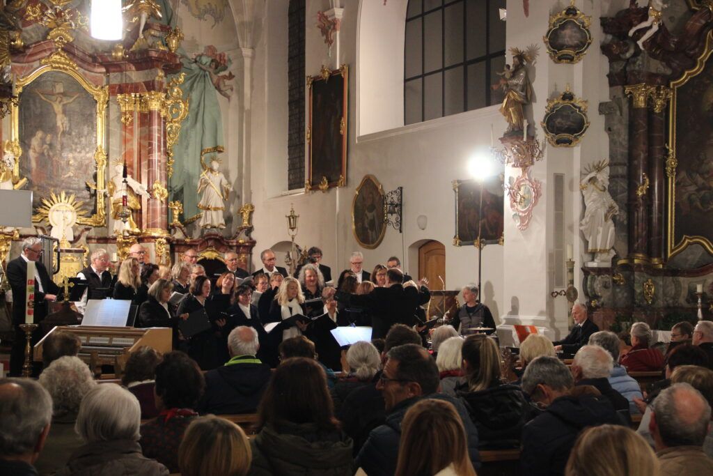 Arnach – Seit April hatten sie sich vorbereitet. 14 Projektsänger aus Arnach und Umgebung, vor allem aus Immenried, waren hinzugestoßen. Vom Stammchor hatten zwei Drittel sich dem anspruchsvollen Projekt angeschlossen. Lohn der Mühen: Mehr als 200 Besucher spendeten am 13. Oktober im barocken Ambiente der Arnacher Pfarrkirche stehend lang anhaltenden Applaus für das Konzert des Kirchenchores Arnach. Sylvia Buchbinder, die Vorsitzende des Kirchenchors, warf in ihrer Danksagung den Blick zurück auf das Bestreben, ein so anspruchsvolles Programm zu erarbeiten. Mit „Geduld und Humor“ habe es Chorleiter Wolfgang Roth geschafft, aus den 28 Sängern und Sängerinnen und den sie begleitenden Instrumentalisten Robert Häusle (Orgel, E-Piano) und Thomas Baumann (Schlagzeug, Röhrenglocken) eine Einheit zu formen. Und diese Einheit zeigte, nach einer kleinen anfänglichen Unsicherheit, die aber souverän überspielt wurde, eine glänzende Leistung.