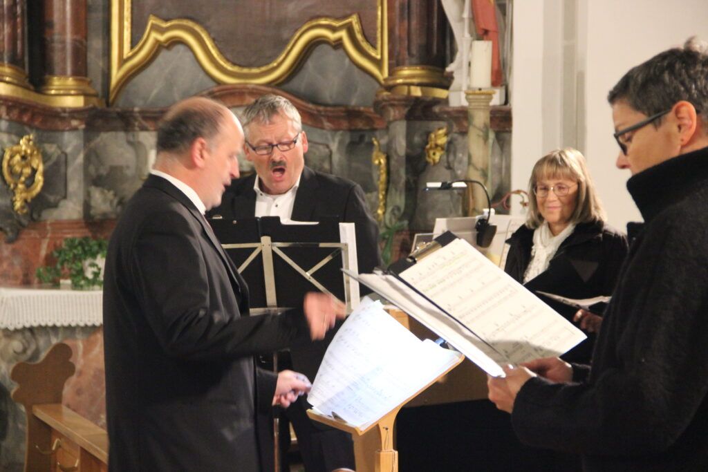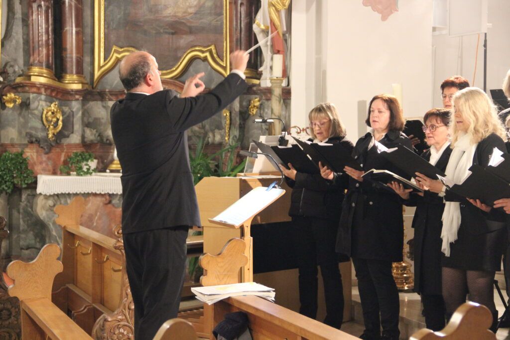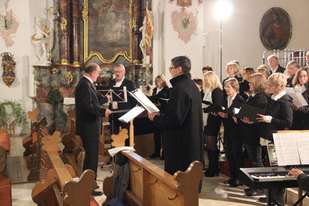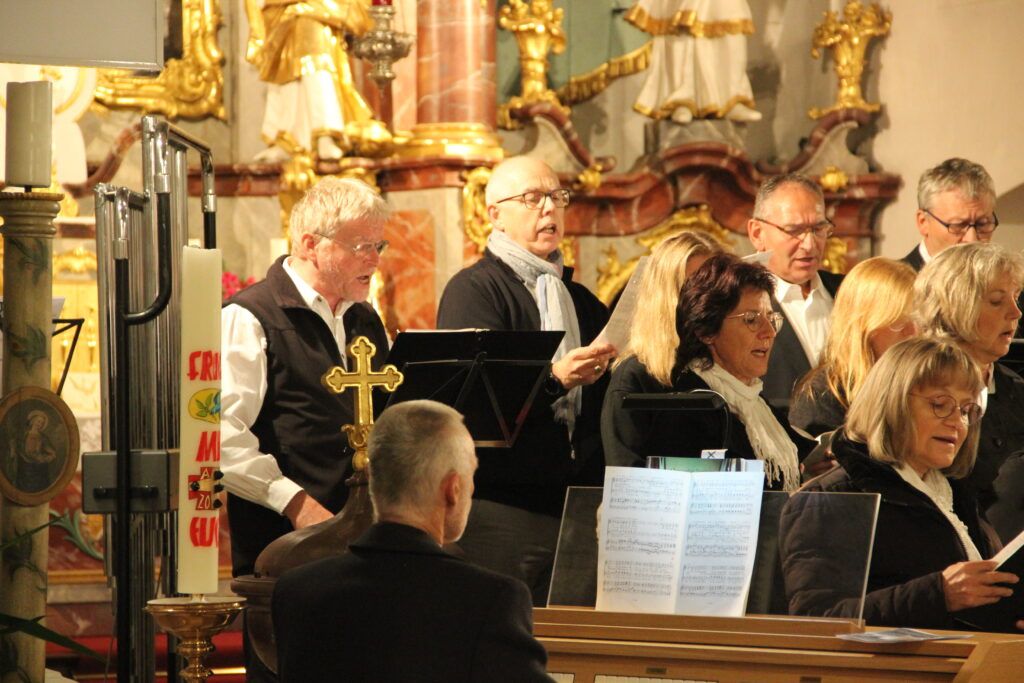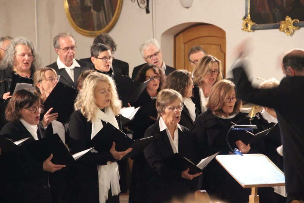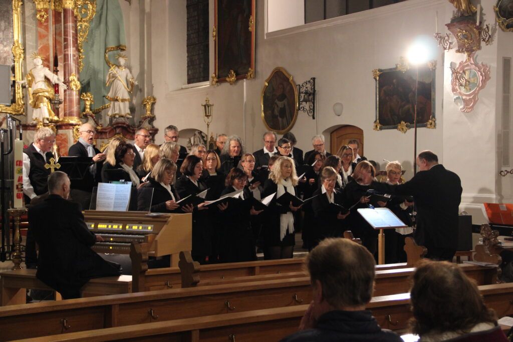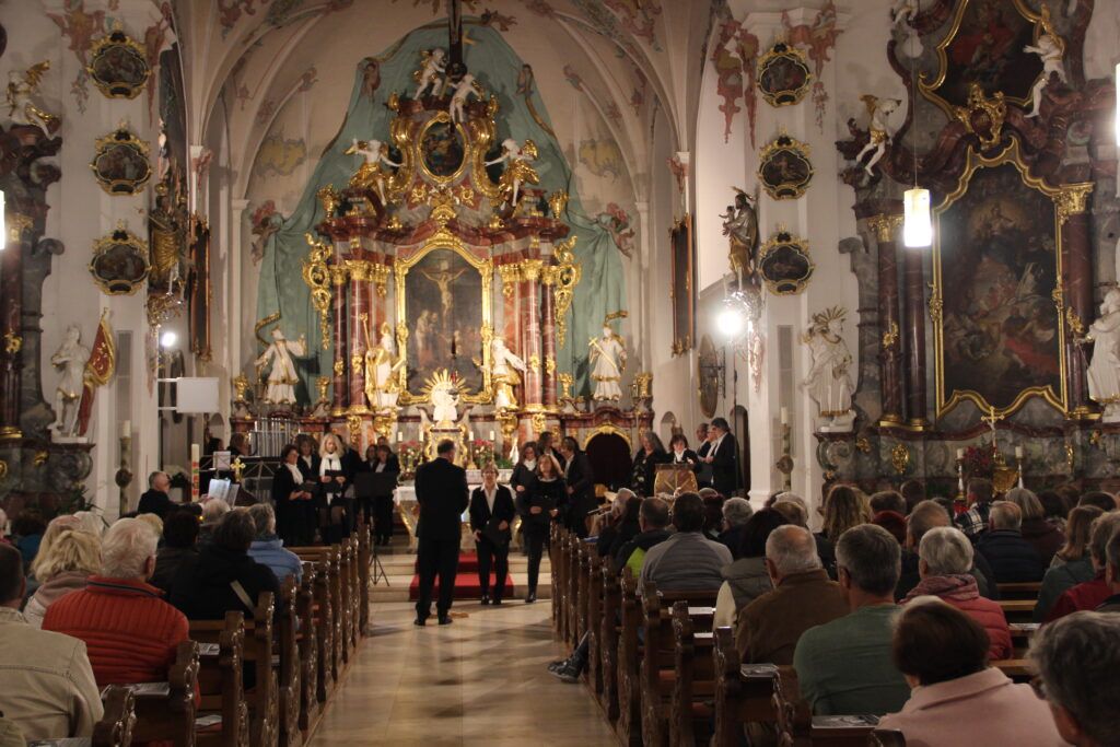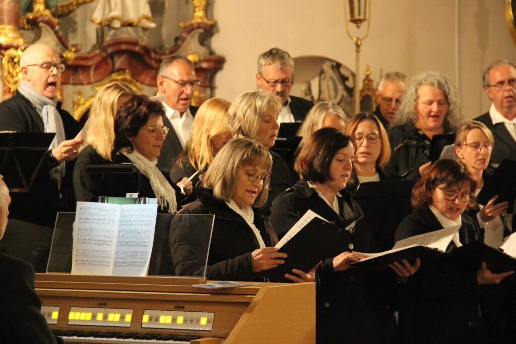 Arnach – Seit April hatten sie sich vorbereitet. 14 Projektsänger aus Arnach und Umgebung, vor allem aus Immenried, waren hinzugestoßen. Vom Stammchor hatten zwei Drittel sich dem anspruchsvollen Projekt angeschlossen. Lohn der Mühen: Mehr als 200 Besucher spendeten am 13. Oktober im barocken Ambiente der Arnacher Pfarrkirche stehend lang anhaltenden Applaus für das Konzert des Kirchenchores Arnach. Sylvia Buchbinder, die Vorsitzende des Kirchenchors, warf in ihrer Danksagung den Blick zurück auf das Bestreben, ein so anspruchsvolles Programm zu erarbeiten. Mit „Geduld und Humor“ habe es Chorleiter Wolfgang Roth geschafft, aus den 28 Sängern und Sängerinnen und den sie begleitenden Instrumentalisten Robert Häusle (Orgel, E-Piano) und Thomas Baumann (Schlagzeug, Röhrenglocken) eine Einheit zu formen. Und diese Einheit zeigte, nach einer kleinen anfänglichen Unsicherheit, die aber souverän überspielt wurde, eine glänzende Leistung.