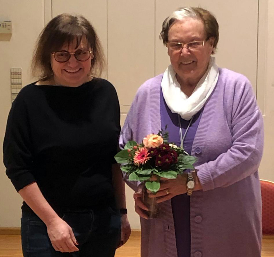Abschied nach mehr als 40 Jahren aktiven Singens: Kirchenchorvorstand Sylvia Buchbinder überreicht der langjährigen Chorsängerin Gabi Schöllhorn Blumen.