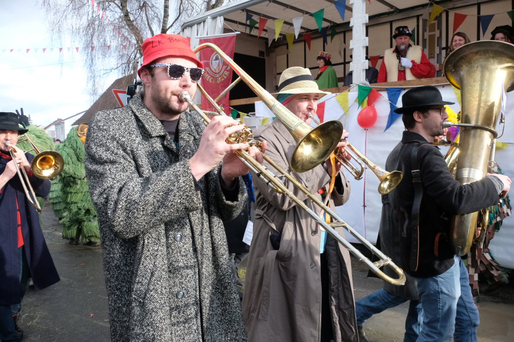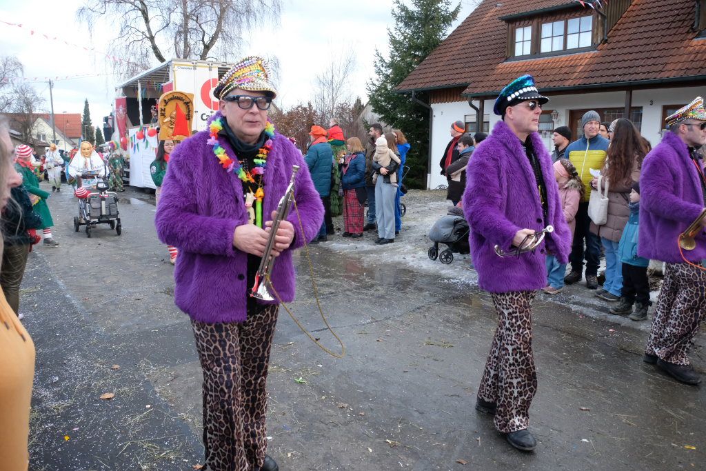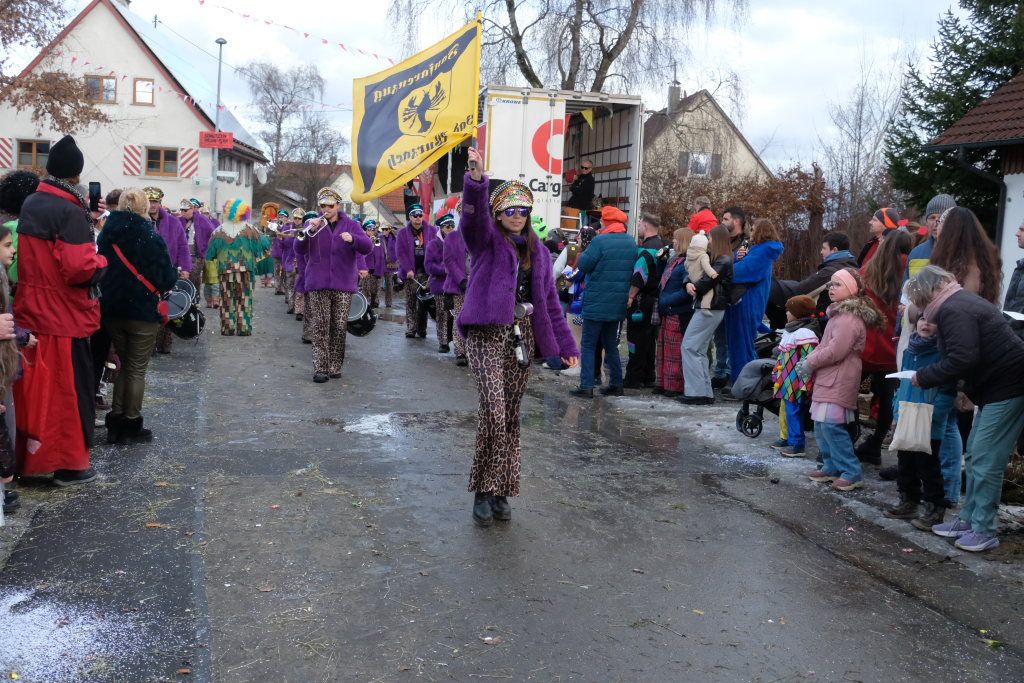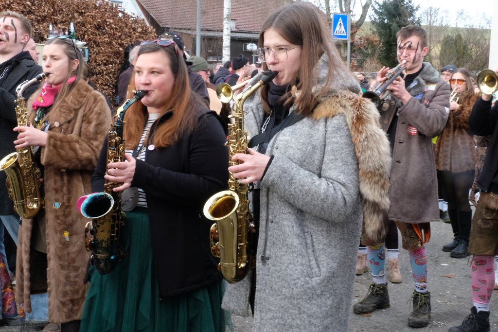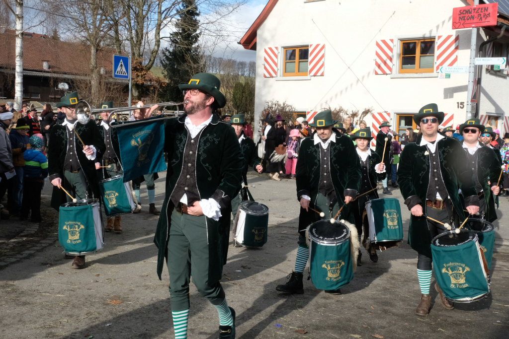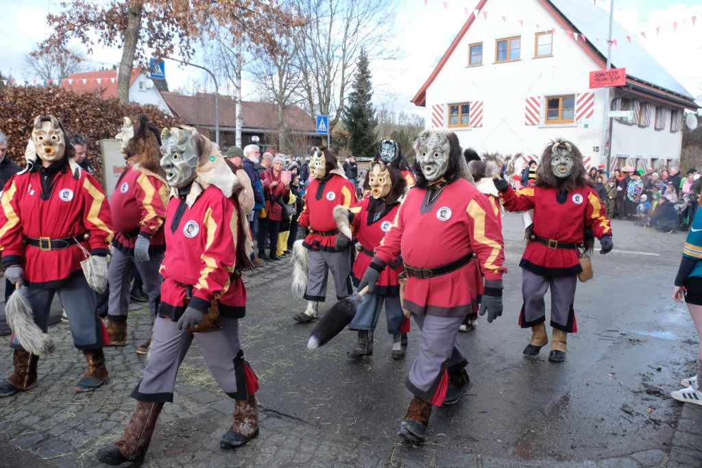 Pünktlich um 14.00 Uhr eröffnete die Musikkapelle Haidgau den Narrensprung gemeinsam mit Fahnenabordnung, Narrensamen, sowie Wachtmeister und Fasnetslader, den beiden besonderen Einzelfiguren der Haidgauer Zunft. Und noch eine weitere Gruppe aus der Ortschaft folgte ihnen: Die Kindergarten-Kinder von St. Nikolaus, deren Narrenruf bezeichnenderweise „Schrei-Hälse“ lautete.