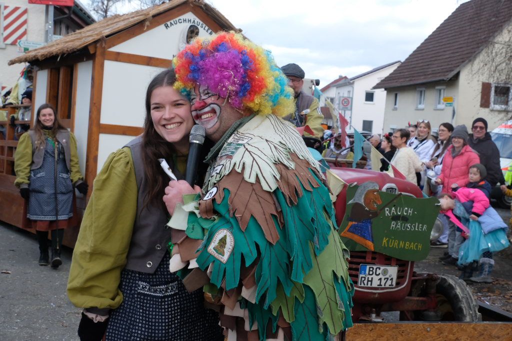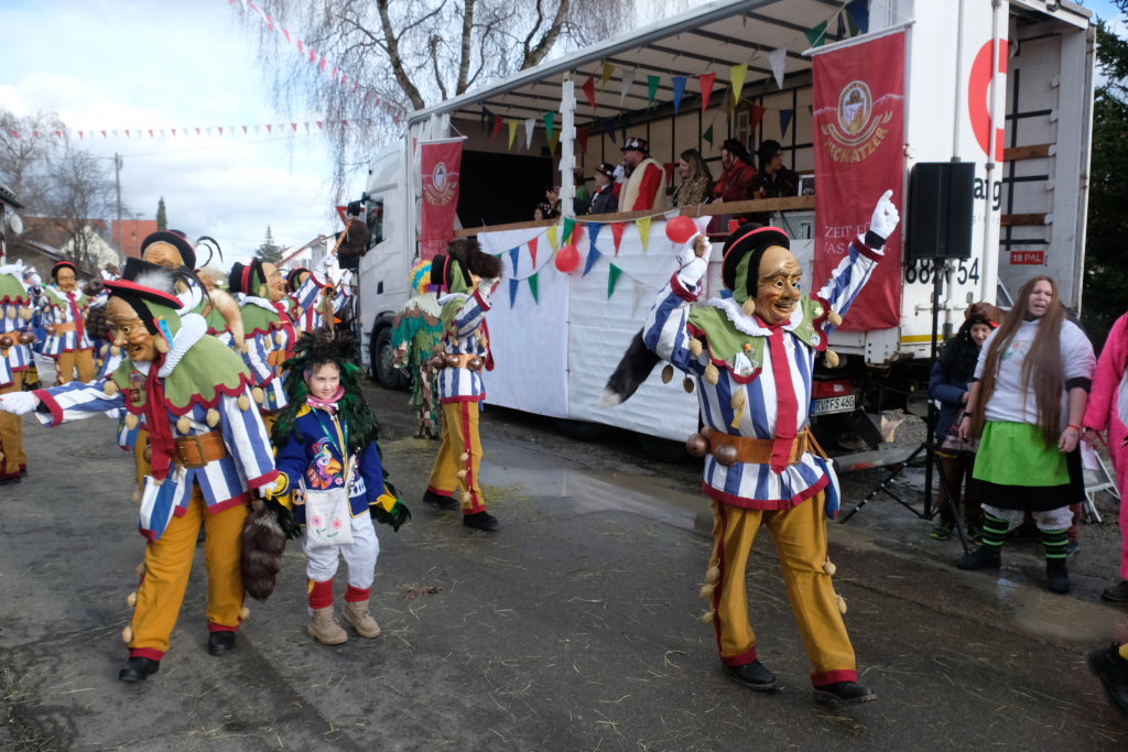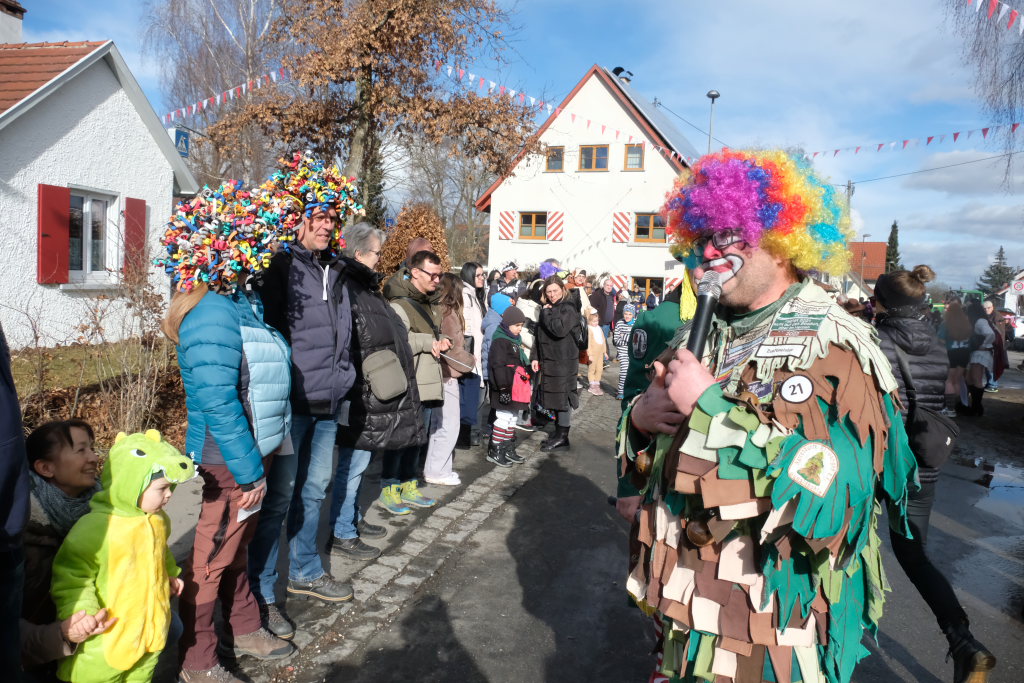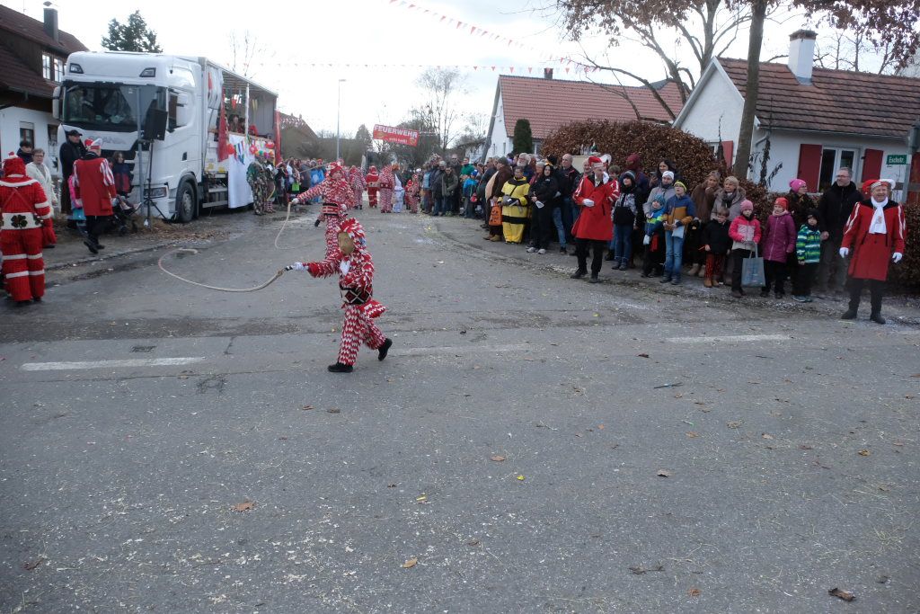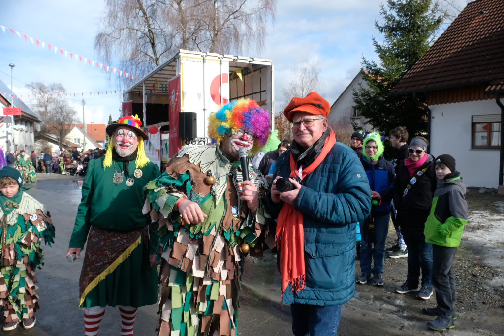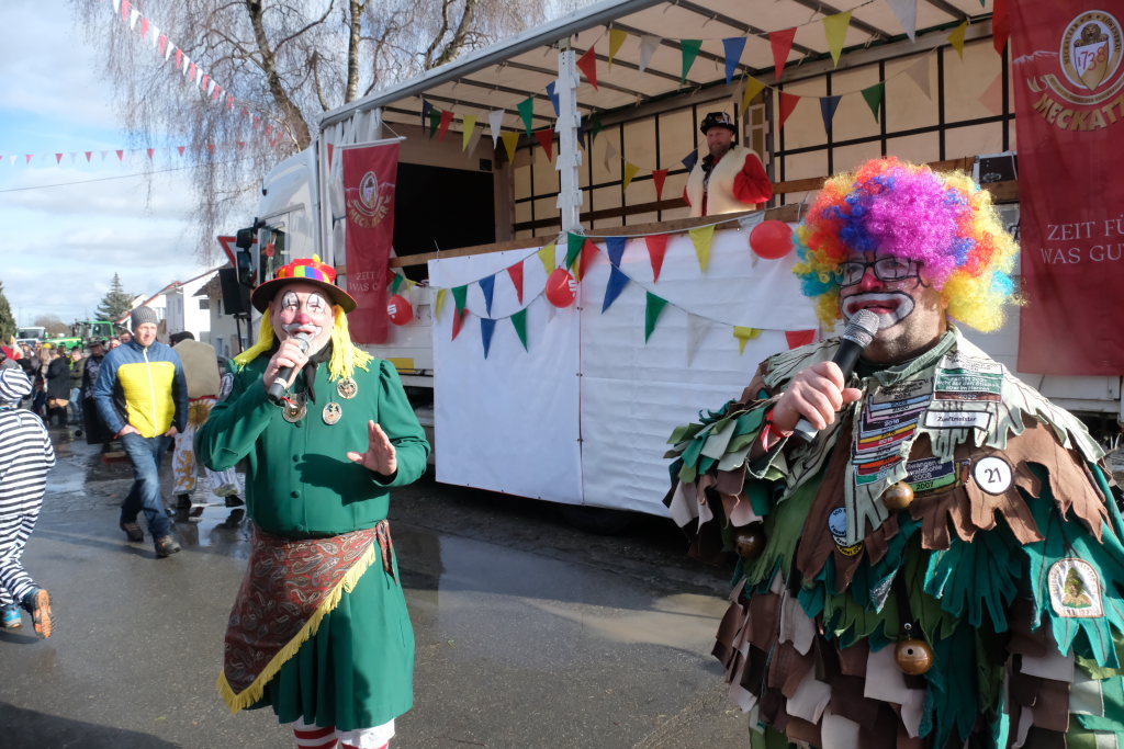 Haidgau – Beim diesjährigen Narrensprung haben die Verantwortlichen bewusst die Bremse gezogen, nachdem beim Jubiläum im Vorjahr alle ANR-Zünfte eingeladen werden mussten. Mit 48 Umzugspositionen war er deutlich kürzer als im Vorjahr. Gleichgeblieben aber ist der hohe Unterhaltungswert, den Günther „Turbo“ Angele und Alex Wild – in diesem Jahr als Clowns getarnt – als Moderatoren und Ansagern den zahlreichen Besuchern und den Ehrengästen auf der zur Ehrentribüne umgestalteten LKW-Pritsche boten.
