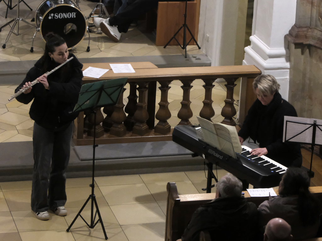 Mit der hervorragend interpretierten „Sonate in G-Moll“ von Johann Sebastian Bach geleiteten Anna Butscher an der Querflöte und Bernadette Vogt am Piano die Atmosphäre wieder in ruhigere Gefilde. Später zeigten die Beiden noch einmal mit „Aria“ von John Rutter ihr großes musikalisches Können.