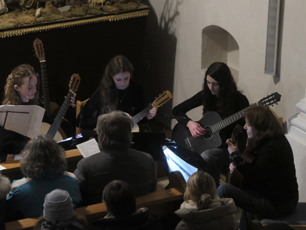 Noch zweimal trat der Chor mit Textrezitationen auf: Mit „Zeit des Tanzens“ im Mittelgang und „Zeit des Untergangs“ an den Seiten. Dazwischen konzertierte das Gitarrenensemble um Gisela Hecht mit Corinna Gut, Valerie Gut und Nora Mangler u.a. mit zwei Menuetten und „All in the Garden green“ einem von John Playford 1650 geschriebenen Renaissance-Tanz.