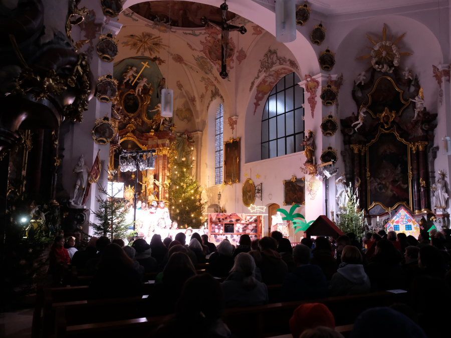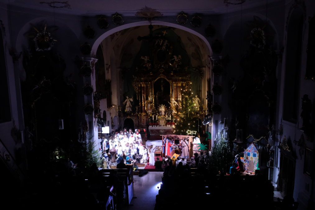 Wie beim modernen Theater heute üblich, gab es auch in der Arnacher Kirche nicht nur einen Bühnenschauplatz, sondern mehrere: Das Mädchen Julia kommentierte das Geschehen vom rechten Seitenaltar aus. Im Mittelgang begaben sich Maria und Josef auf Herbergssuche, um schließlich im neben dem Ambo aufgebauten Stall mit der Krippe eine Unterkunft zu finden. Der Engelschor begleitete die Herbergssuche musikalisch mit einem Rap-ähnlichen Gesang.