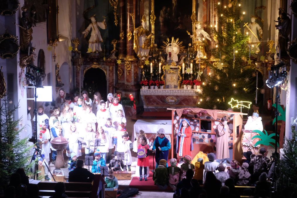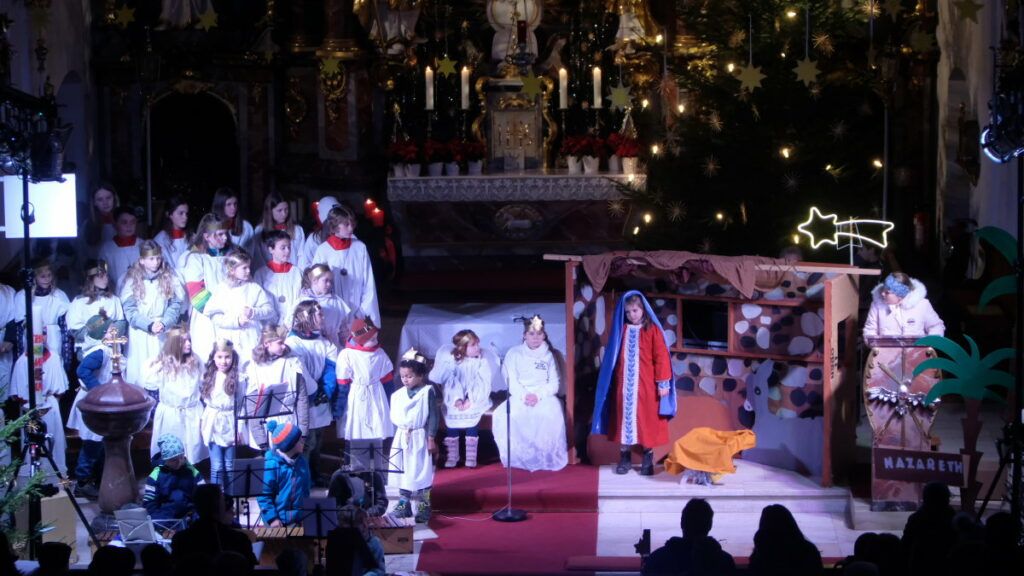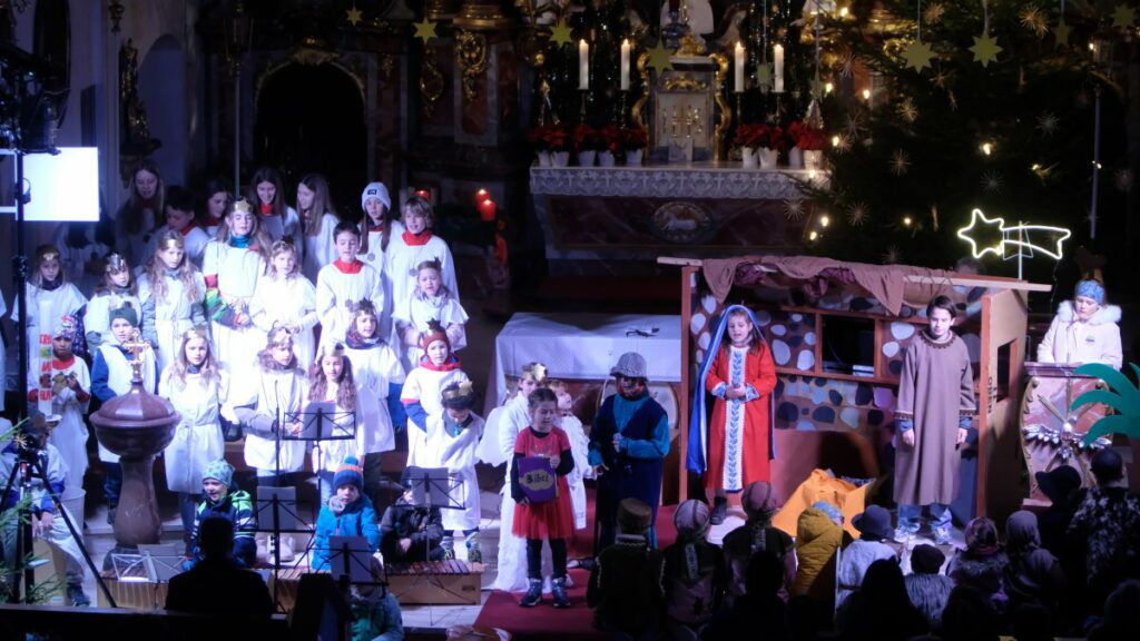 Arnach – Am Nachmittag von Heiligabend fand in der Pfarrkirche St. Ulrich und Margaretha Arnach wieder das tradionelle Krippenspiel statt. Die Kinder aus dem Kindergarten und der Grundschule Arnach führten unter der Leitung von André Radke die Weihnachtsgeschichte aus Sicht eines kleinen Mädchens namens Julia auf. Die kleinen Schauspieler und auch die Kinder aus dem Engelschor und aus der Orchestergruppe konnten sich über einen sehr guten Besuch in der weihnachtlich dekorierten Kirche freuen.