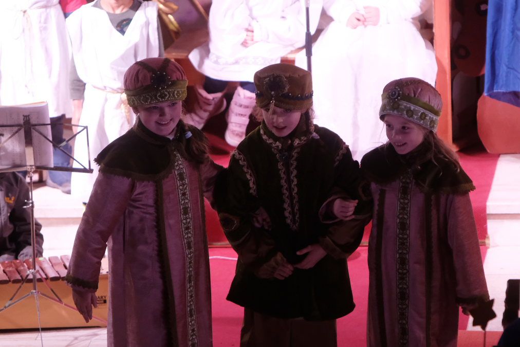 Der Mittelgang wurde zur Verkehrsader des Spiels: Dort wurden die drei dem Stern nach Bethlehem folgenden Könige aus dem Morgenland von Fanfarenstößen bei ihrem Besuch beim Statthalter angekündigt, aber über diesen gelangten sie wie auch die Hirten nach der Verkündigung durch die Engel zum Stall. Wo diese dann von einer resoluten Maria ihre Plätze angewiesen bekamen, nachdem sie zuvor die Geburt Jesu auf etwas unkonventionelle Art dargestellt hatte.