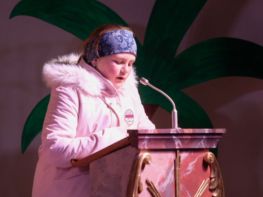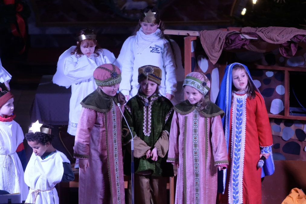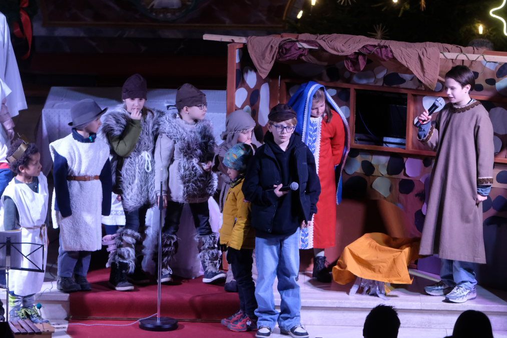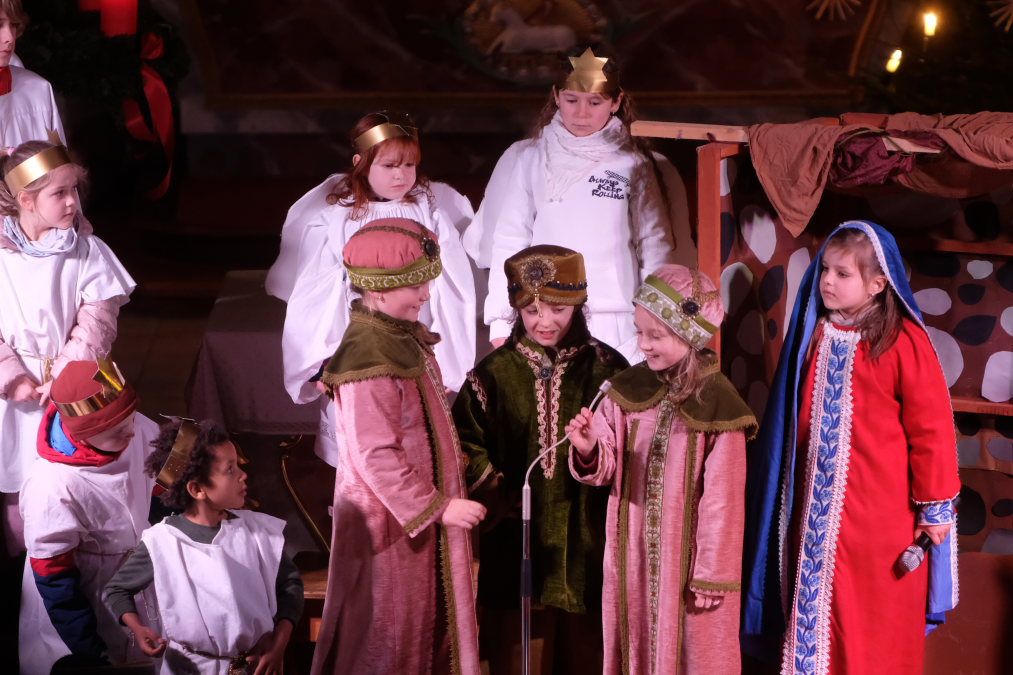 Kurz vor Beginn der Aufführung herrschte aufgeregtes Gewusel in der Kirche, die fast bis auf den letzten Platz gefüllt war. Der Engelschor hatte sein Podest beim Taufbecken erklommen, das Orchester an seinen Instrumenten Platz genommen, die Darsteller hatten ihre vorgesehenen Positionen eingenommen, als Schul- und Spielleiter André Radke in Begleitung von Ministranten in die Kirche einzog, um den Wortgottesdienst bzw. das Krippenspiel feierlich zu eröffnen.
