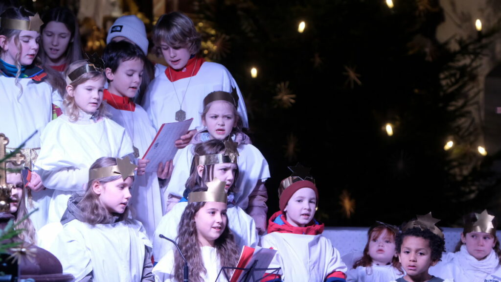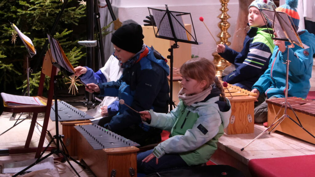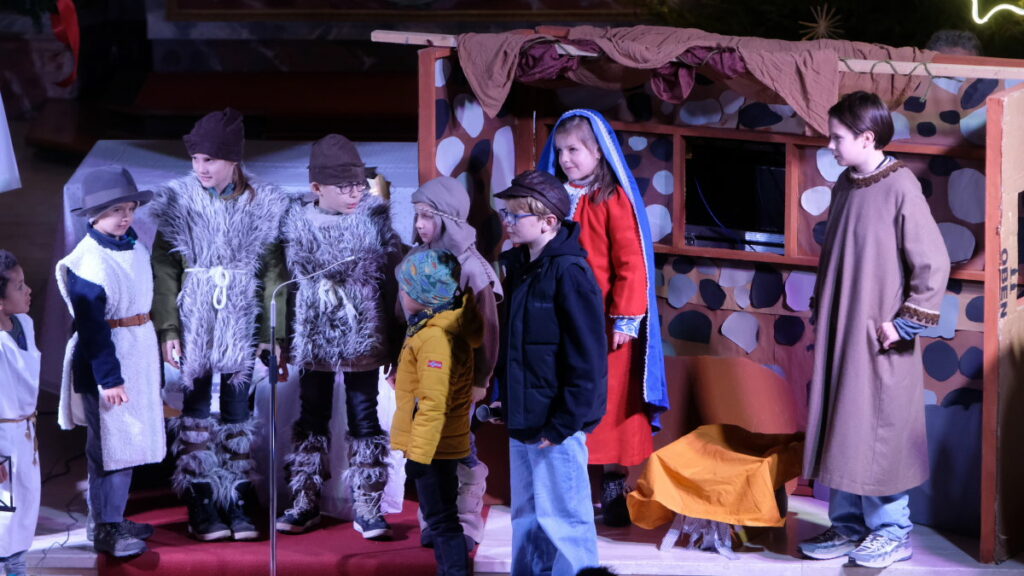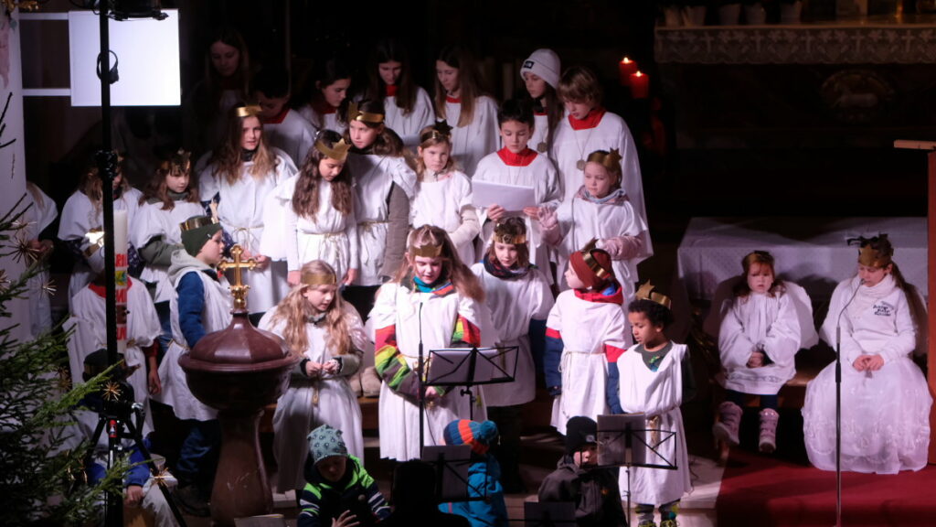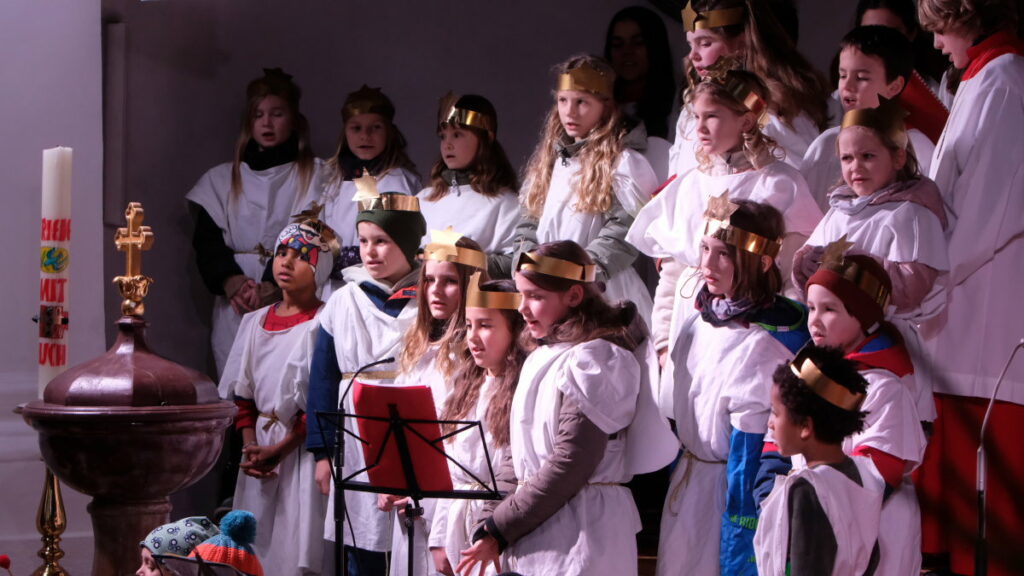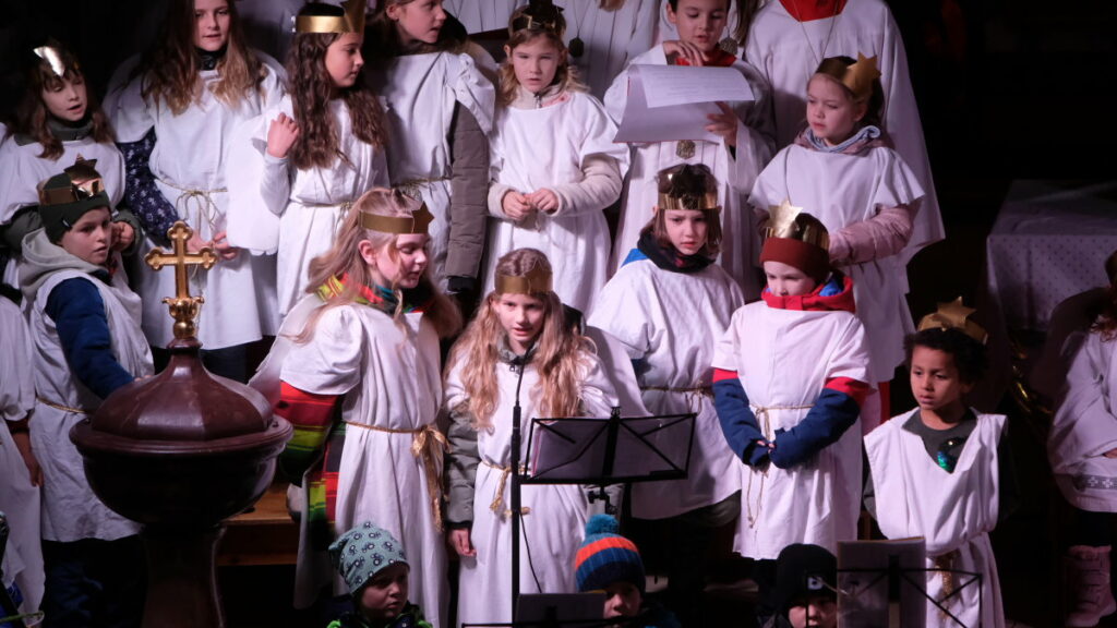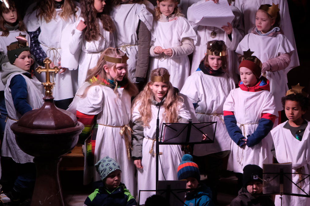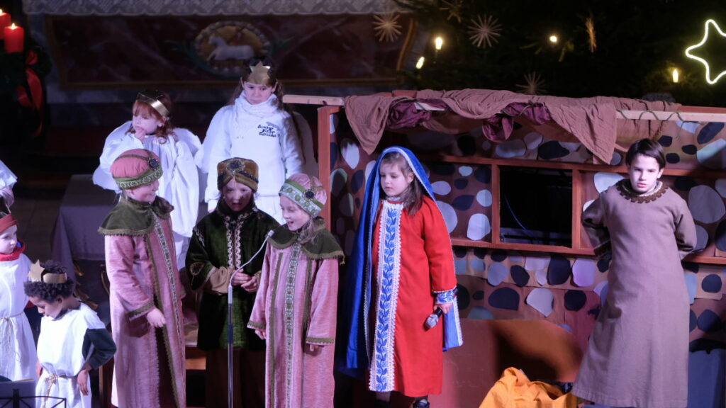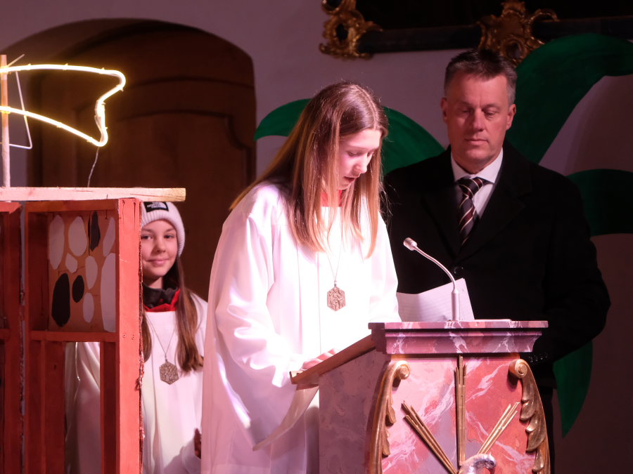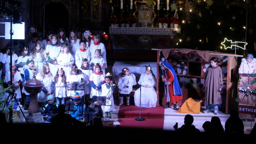 Kurz vor Beginn der Aufführung herrschte aufgeregtes Gewusel in der Kirche, die fast bis auf den letzten Platz gefüllt war. Der Engelschor hatte sein Podest beim Taufbecken erklommen, das Orchester an seinen Instrumenten Platz genommen, die Darsteller hatten ihre vorgesehenen Positionen eingenommen, als Schul- und Spielleiter André Radke in Begleitung von Ministranten in die Kirche einzog, um den Wortgottesdienst bzw. das Krippenspiel feierlich zu eröffnen.