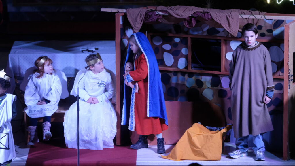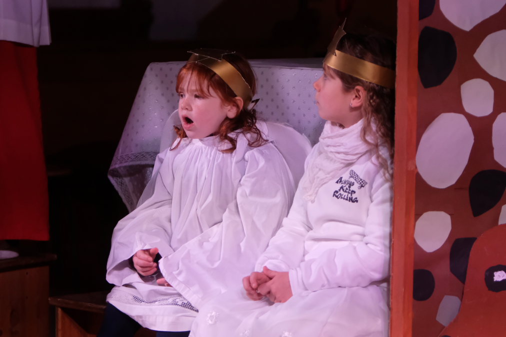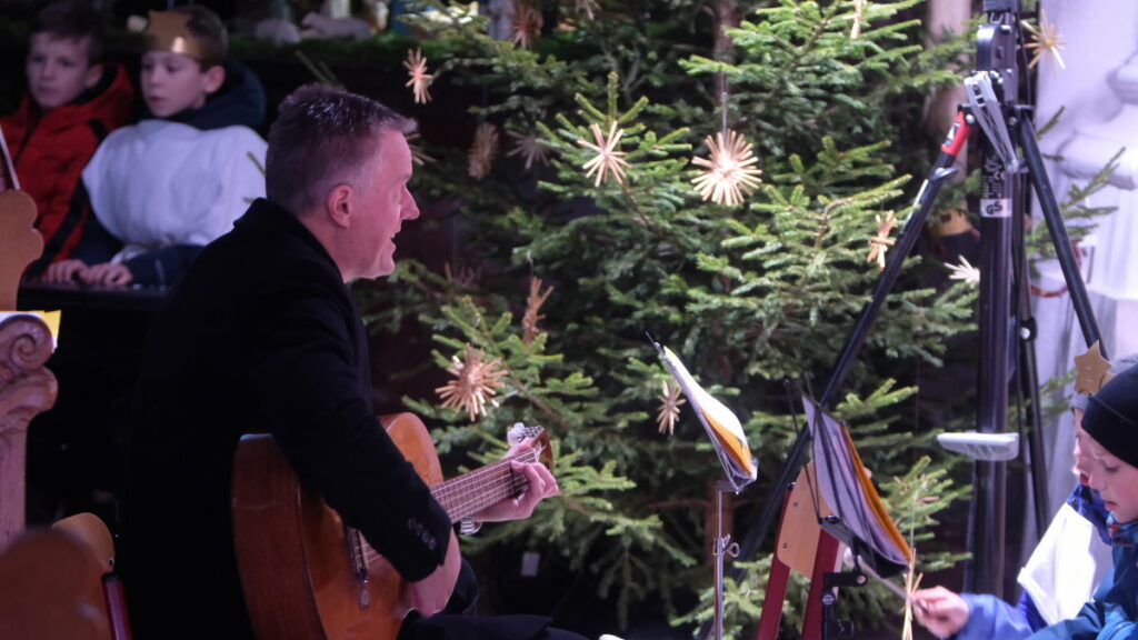 Die Aufführung des Krippenspiels hielt die Kinder und Lehrer bzw. ErzieherInnen des Bildungshauses in den vergangenen Wochen kräftig in Atem. Es galt, die phantasievoll gestalteten Kulissen zu bauen und die Kostüme anzufertigen bzw. aus den verschiedenen Fundussen zu besorgen. Vor allem aber mussten die Rollen verteilt und Texte gelernt werden sowie die Lieder einstudiert werden. In seiner Begrüßung sagte Radke, in der Vorfreude auf das Krippenspiel und Weihnachten seien in diesen Wochen die Lehrer und Erzieherinnen ganz nah bei den Kindern gewesen. Radke selbst spielte Gitarre und hielt die musikalischen und dramaturgischen Fäden zu Füßen des Engelchores in der Hand.