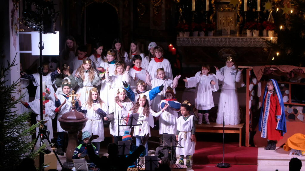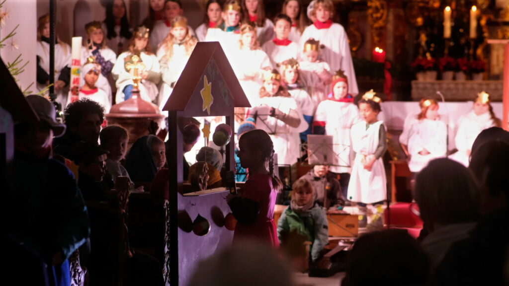 Arnach – Am Nachmittag von Heiligabend fand in der Pfarrkirche St. Ulrich und Margaretha Arnach wieder das tradionelle Krippenspiel statt. Die Kinder aus dem Kindergarten und der Grundschule Arnach führten unter der Leitung von André Radke die Weihnachtsgeschichte aus Sicht eines kleinen Mädchens namens Julia auf. Die kleinen Schauspieler und auch die Kinder aus dem Engelschor und aus der Orchestergruppe konnten sich über einen sehr guten Besuch in der weihnachtlich dekorierten Kirche freuen.