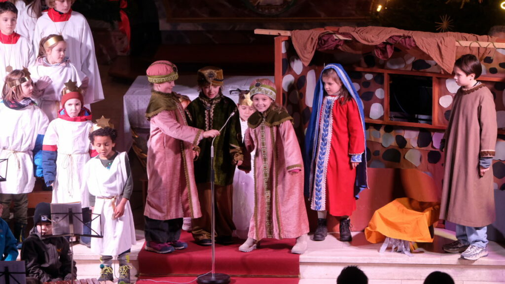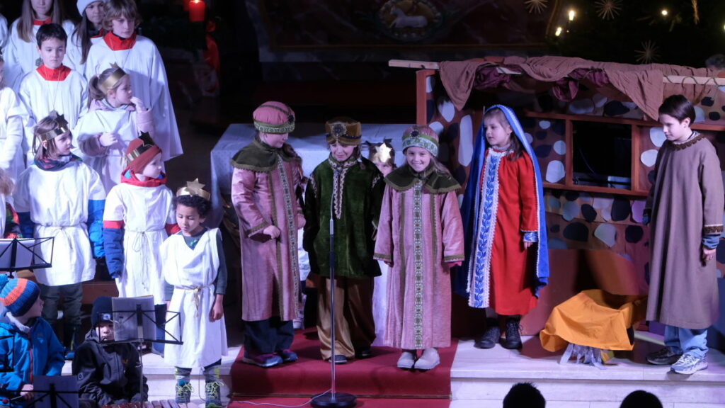 Der Mittelgang wurde zur Verkehrsader des Spiels: Dort wurden die drei dem Stern nach Bethlehem folgenden Könige aus dem Morgenland von Fanfarenstößen bei ihrem Besuch beim Statthalter angekündigt, aber über diesen gelangten sie wie auch die Hirten nach der Verkündigung durch die Engel zum Stall. Wo diese dann von einer resoluten Maria ihre Plätze angewiesen bekamen, nachdem sie zuvor die Geburt Jesu auf etwas unkonventionelle Art dargestellt hatte.
