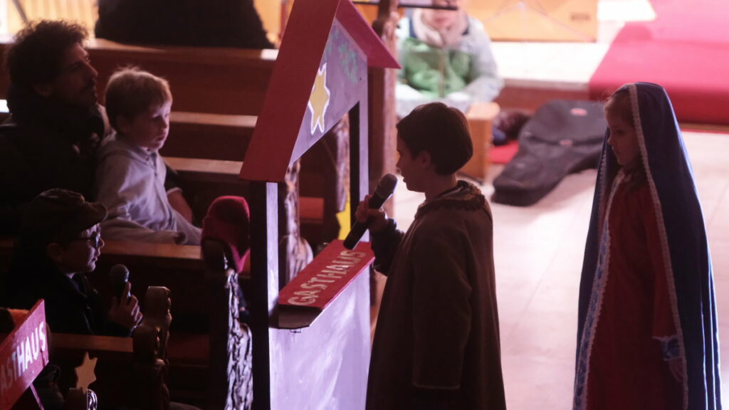 Wie beim modernen Theater heute üblich, gab es auch in der Arnacher Kirche nicht nur einen Bühnenschauplatz, sondern mehrere: Das Mädchen Julia kommentierte das Geschehen vom rechten Seitenaltar aus. Im Mittelgang begaben sich Maria und Josef auf Herbergssuche, um schließlich im neben dem Ambo aufgebauten Stall mit der Krippe eine Unterkunft zu finden. Der Engelschor begleitete die Herbergssuche musikalisch mit einem Rap-ähnlichen Gesang.