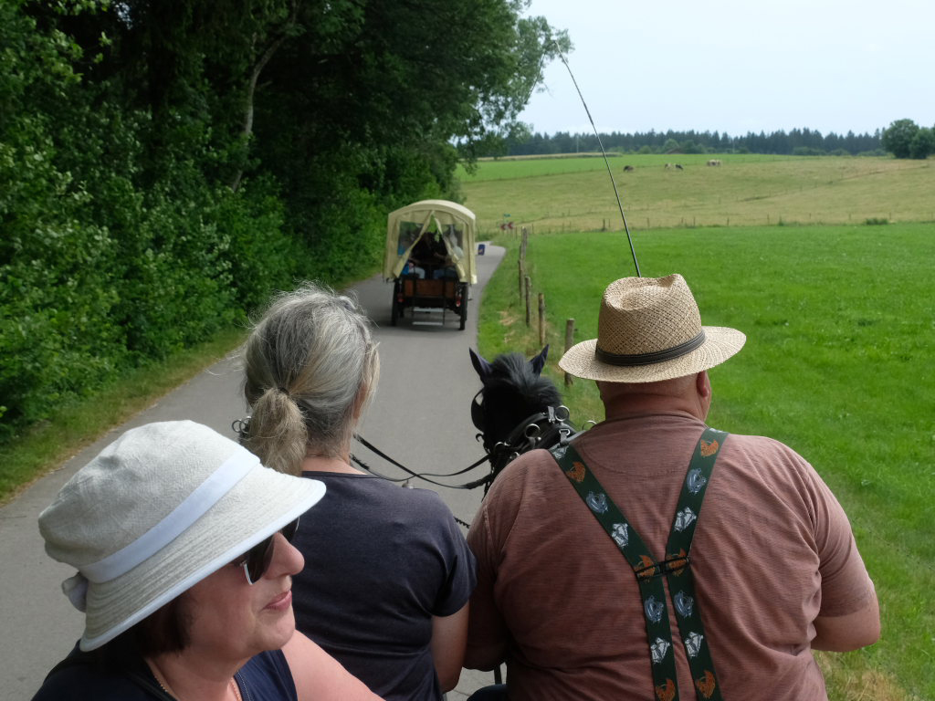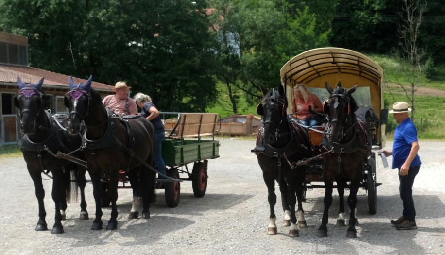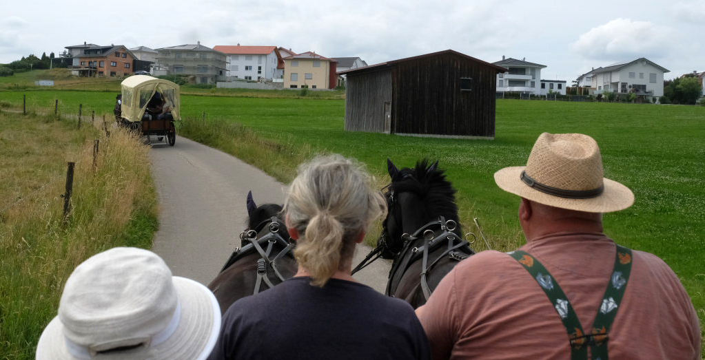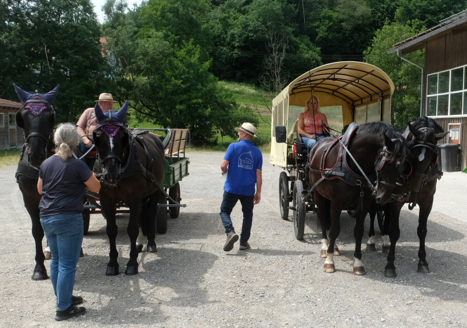 Und so konnte die Gruppe dann gen Hauerz starten, wo bereits die beiden Kutscher Anton Mang und Erwin Sattelberger mit ihren Zweispännern sowie der Organisator der Fahrten, Josef Dobler junior die Gäste bei der Reithalle erwarteten. Rasch wurden die Plätze der Kutschen besetzt und los ging es. Während die vorausfahrende Kutsche von Sattelberger eine Plane hatte, wehte den Passagieren der Mang-Kutsche der Fahrtwind frei um die Nase.
