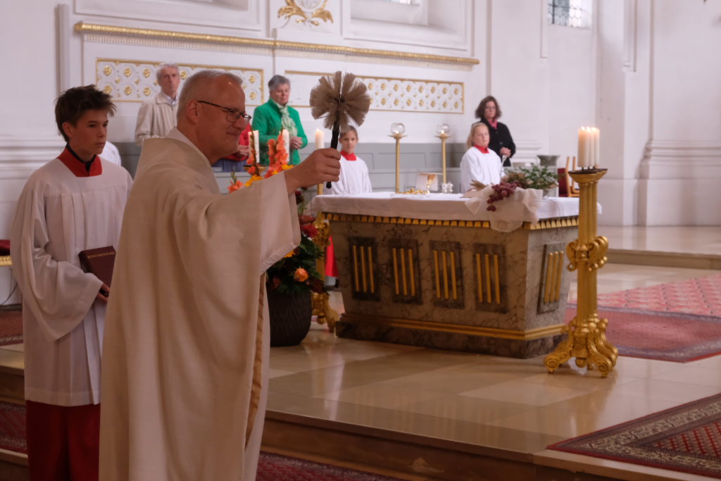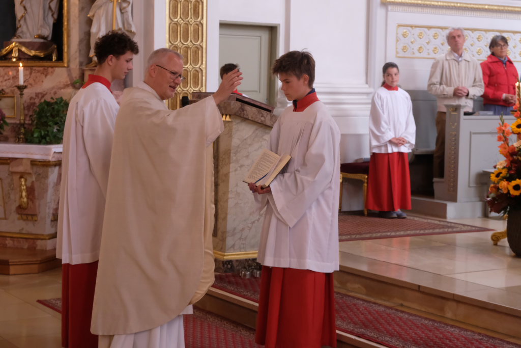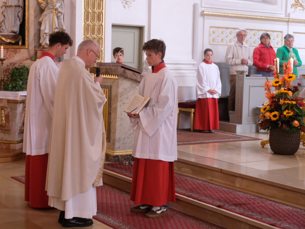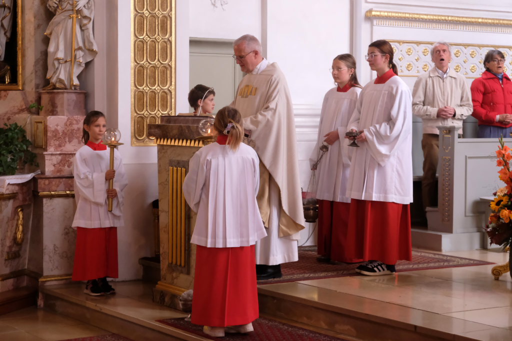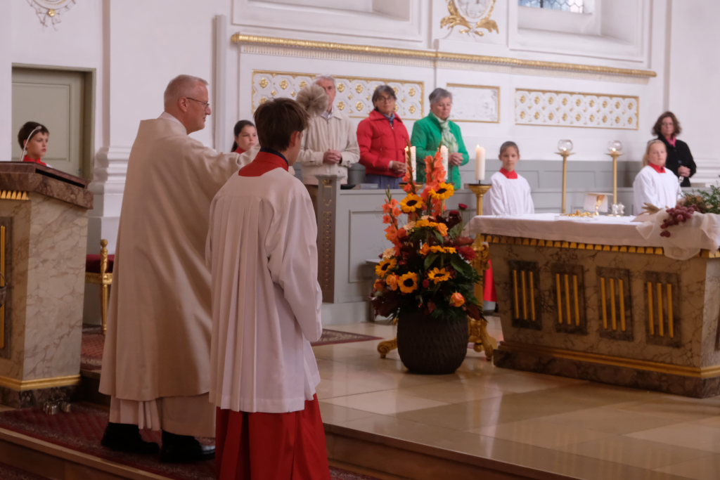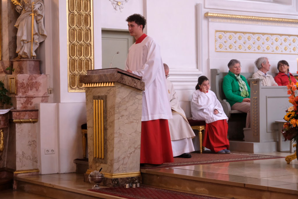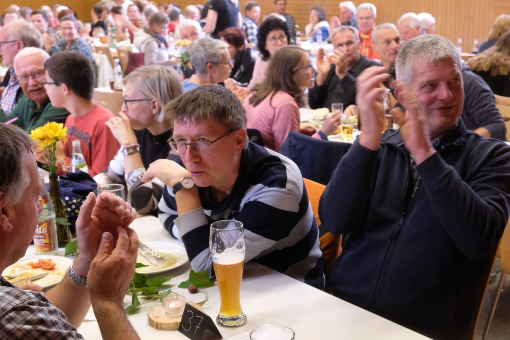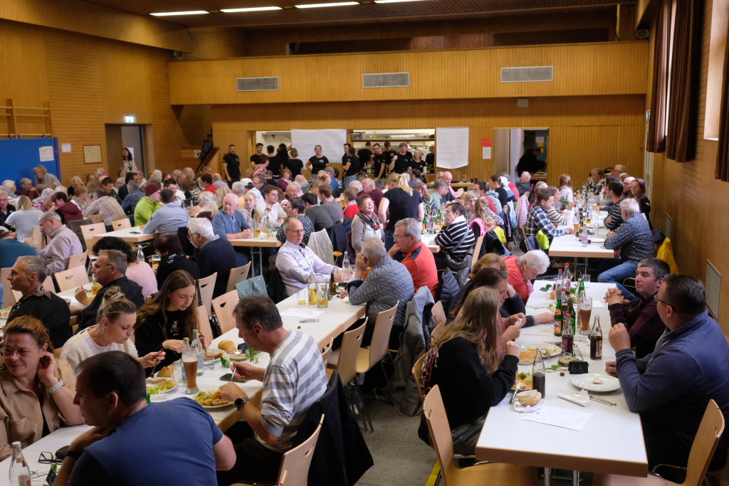 Zum Abschluss des Gottesdienstes lud Oberministrant Luis Vincon, ebenfalls Mitglied bei der Landjugend Gospoldshofen, die Gottesdienstbesucher zum Mittagessen in die gerade einmal einen Steinwurf entfernte Turn- und Festhalle bei der Grundschule ein, um gemeinsam Erntedank zu feiern.