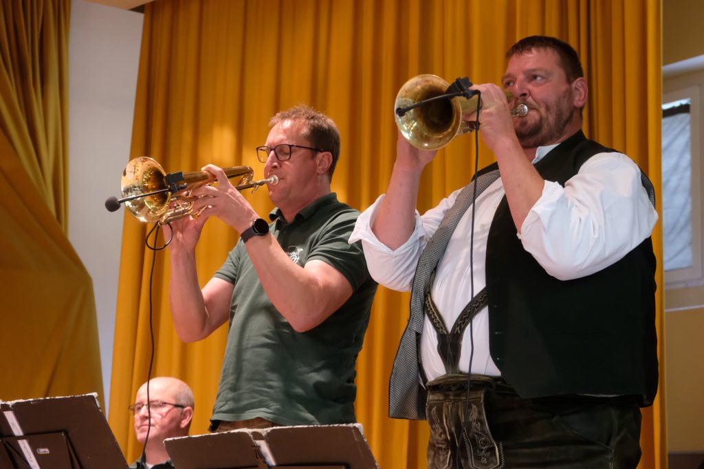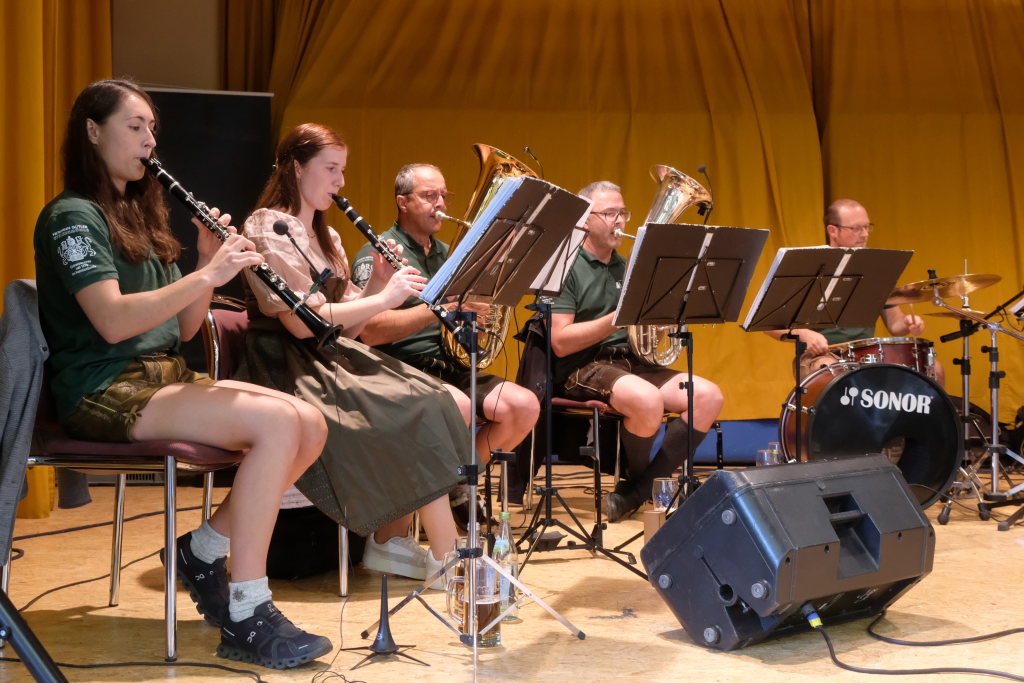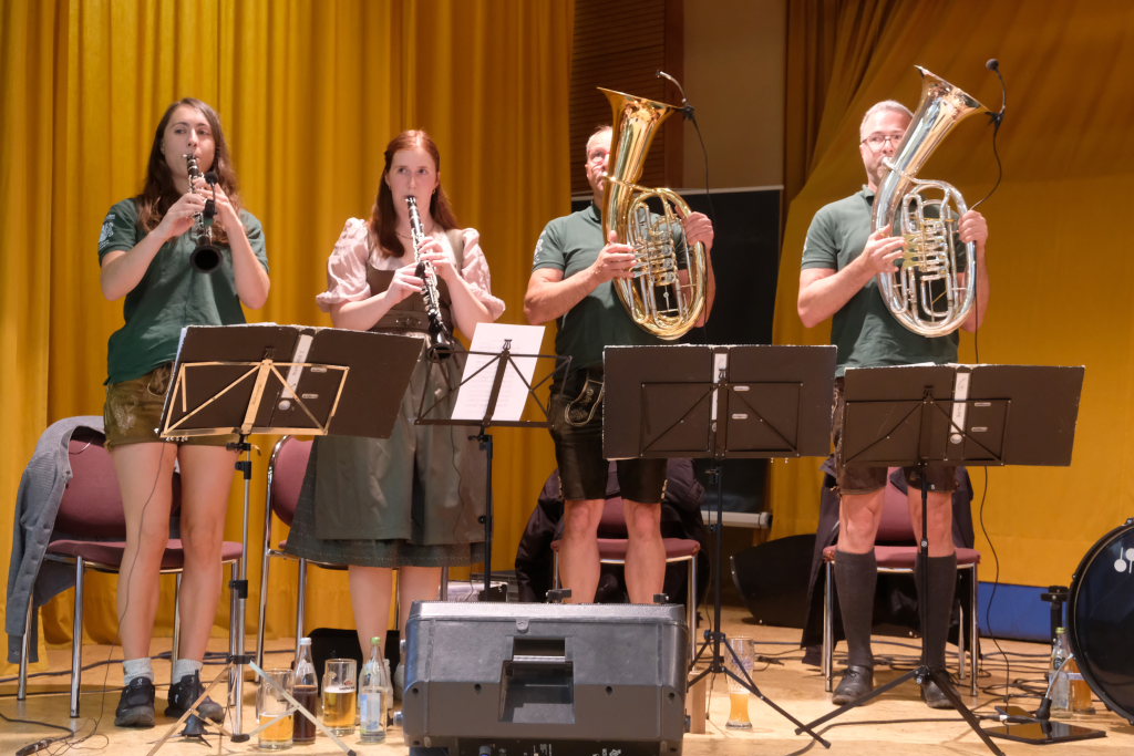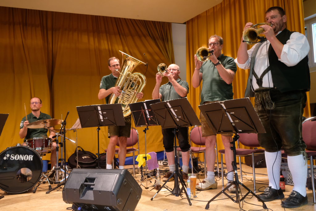 Neuer Namen aber im großen und ganzen dieselben Gesichter: Für die Musik sorgten an diesem Sonntagmorgen die Mühlenfest-Musikanten. Sie spielten nun also zum Frühschoppen bei diesem Erntedankfest der Landjugend Gospoldshofen. Und mit Jochen „JJ“ Jöchle bekam das geneigte Publikum darüber hinaus neben seinem exzellenten Flügelhorn-Spiel auch noch jede Menge humoristische Pointen serviert…