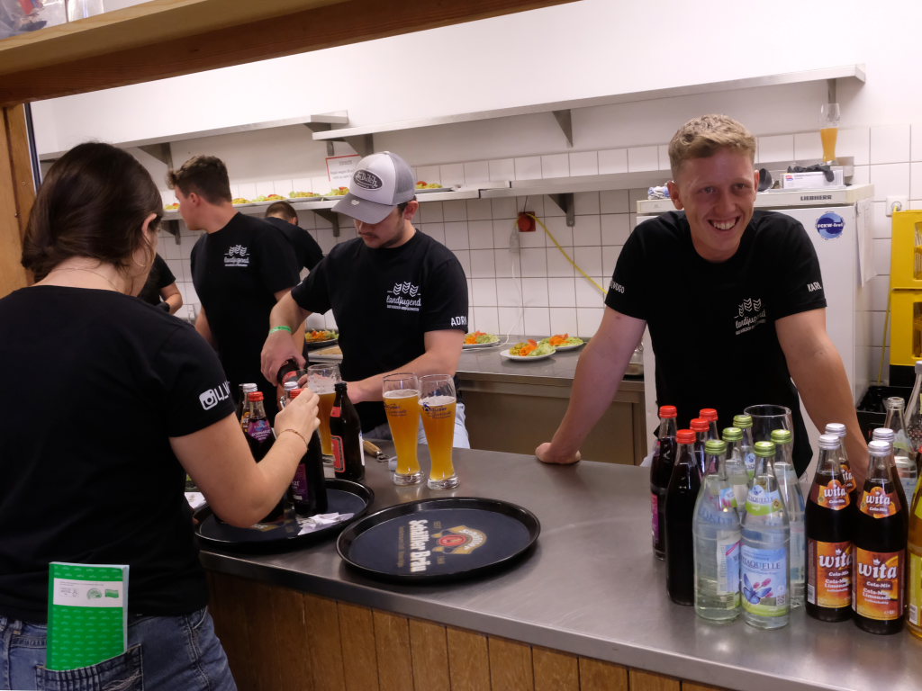 Nach dem Kirchgang kam es also in der mit landwirtschaftlichen Erzeugnissen dekorierten Festhalle zur „Nagelprobe“ für die rund 40 der 57 aktiven Mitglieder. Denn es galt, möglichst rasch ihre essbaren Schmankerl an die Frau, den Mann und auch das Kind zu bringen. Für die Unterhaltung Letztgenannter war mit Mal- und Zeichenecke bestens gesorgt, sodass die Eltern in Ruhe das Fest, das gute Essen und die Unterhaltung mit Bekannten und Freunden genießen konnten. Wie die Kirchenfeste ist auch das Erntedankfest der Landjugend immer ein beliebter Treffpunkt, um sich auszutauschen. Nach dem Mittagessen gab es noch Gelegenheit bei Kaffee und – natürlich selbst gebackene – leckeren Torten und Kuchen, weiter zu plaudern. Oder man ließ sich ein Paket diverser Kuchen- und Tortenstücke für den Nachmittagskaffee einpacken.