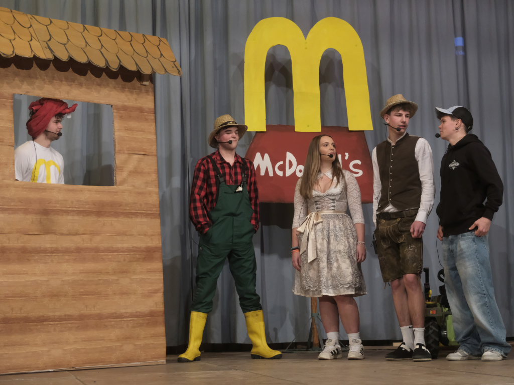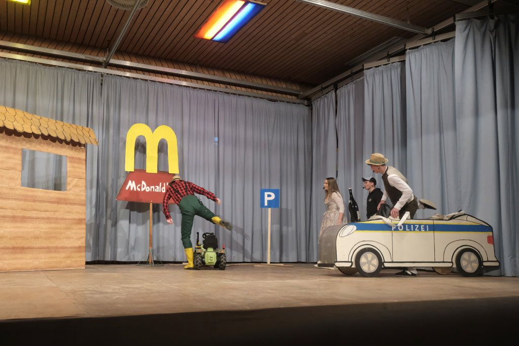 Dann ging es auf große Fahrt: Die Dorfjugend machte sich mit Traktor und Polizeiwagen (und Dreiliter-Flasche Meckatzer) auf zur brandneuen McDonalds-Filiale in der großen Kreisstadt Bad Waldsee, wo es dann auch gleich wegen gewisser Sprachbarrieren zu Verwicklungen kam.