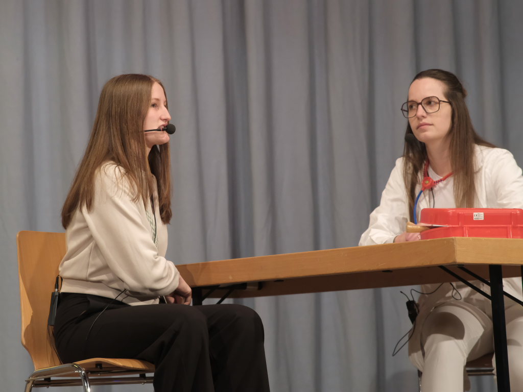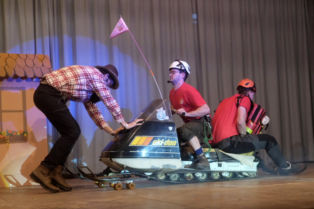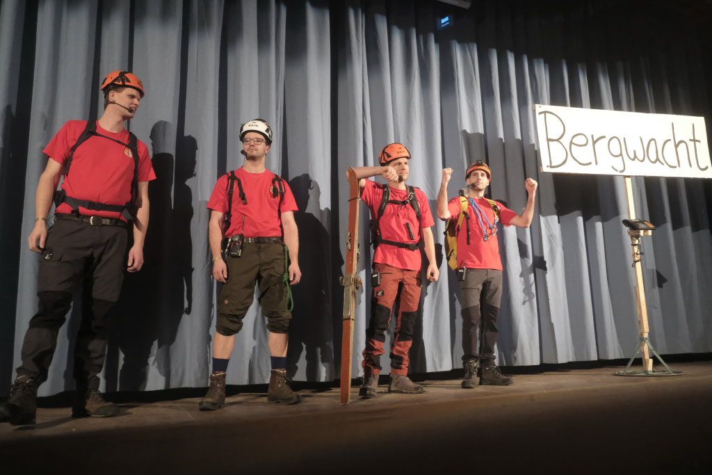 Um die Atmosphäre wieder etwas zu entspannen, kam der Tanz der LJG-Mädels gerade recht, der mit Licht- und Nebeleffekten den Fokus neu ausrichtete. Die LJG-Jungs eröffneten in Unterschwarzach eine Zweig-Station der Bergwacht, und das natürlich wieder mit allerhand technischen Finessen. Da bretterte schon mal ein echter Ski-Doo über die Bühne, nur der Rettungs-Hubschrauber war etwas zu groß (und wohl auch etwas zu teuer), der passte beim besten Willen nicht in die Halle in Unterschwarzach. Natürlich hofften die beiden Bergwacht Teams darauf, eine ruhige Kugel zu schieben. Aber die LJG-Jungs wären nicht die die LJG-Jungs, wenn da bei ihrem Sketsch nicht viel Action mit im Spiel wäre. Und sie griffen zu unorthodoxen Methoden um ihre „Kunden“ zu retten: Als Lebensretter-Werkzeug kam schon mal – weil man den eigentlich Defi vergessen hatte – ein Autobatterie-Überbrückungskabel erfolgreich zum Einsatz.