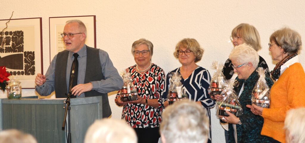 Pfarrer Stefan Maier dankte allen, die sich beim Ökumenischen Seniorenkreis eingebracht haben. Hier auf dem Bild Rosemarie Herdrich, Rita Maucher, Ida Traub, Edeltraut Baur und Uschi Reichert (von links).