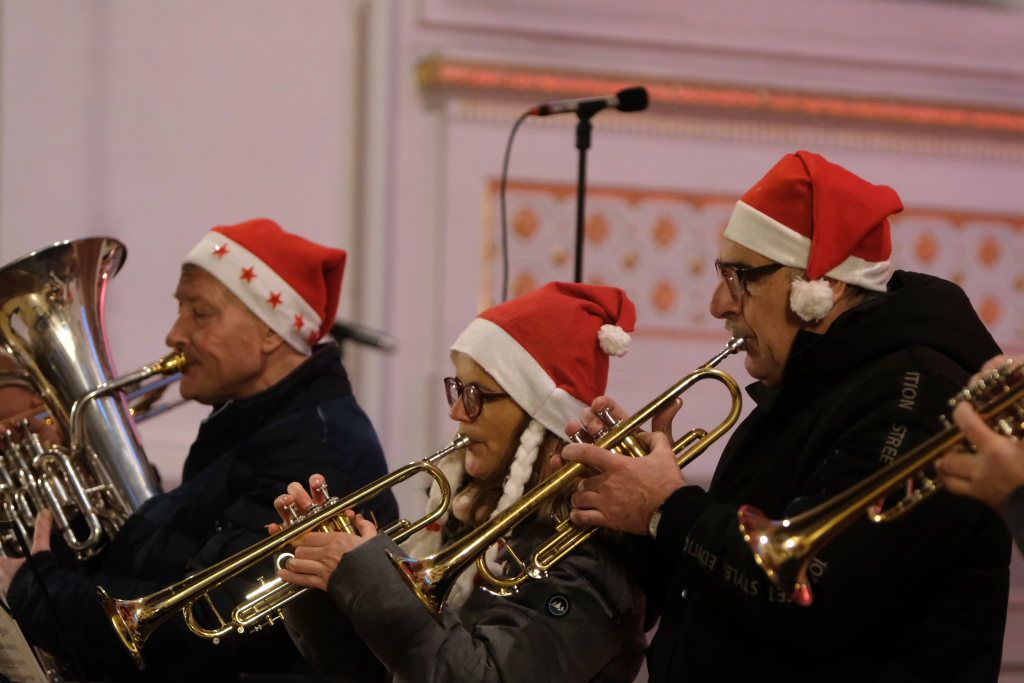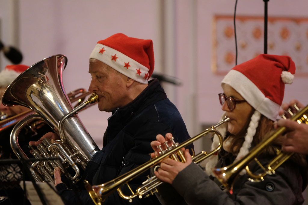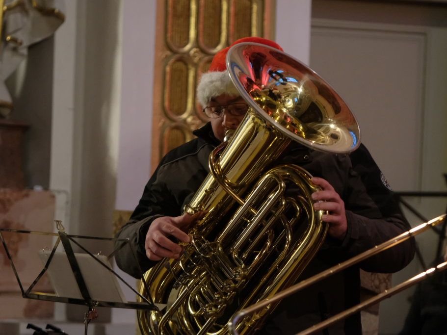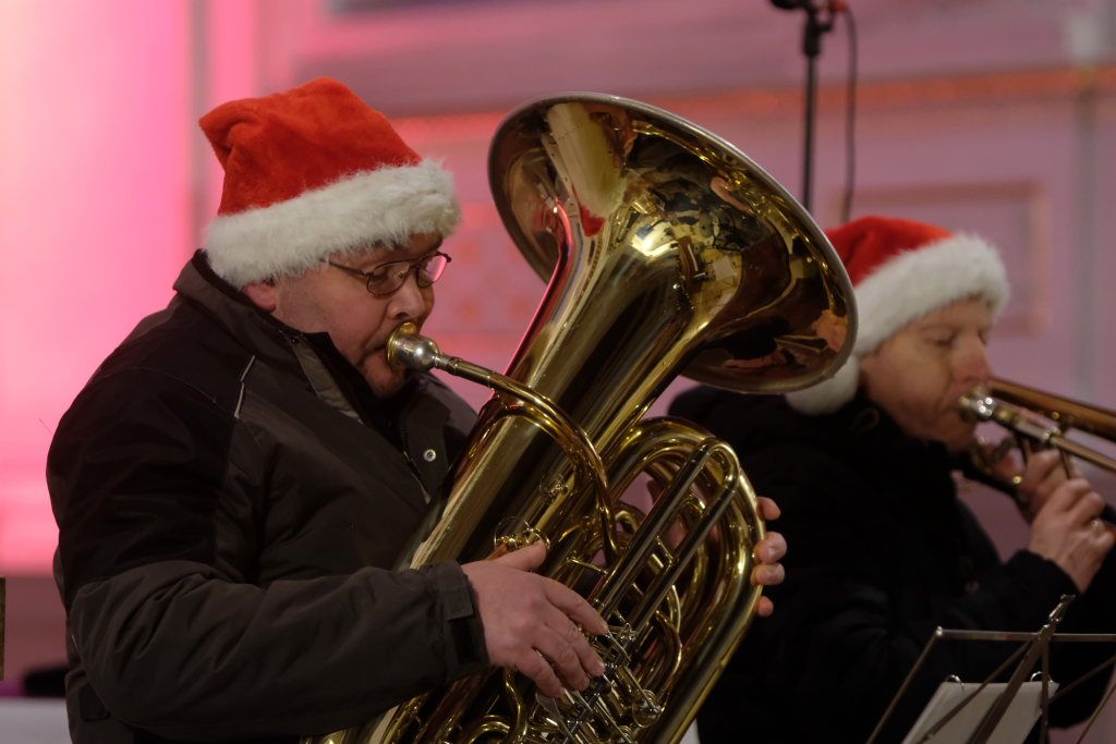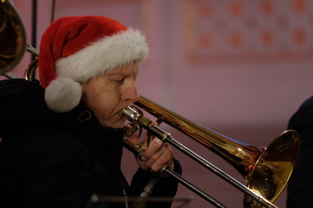 Das Bläsersextett unter der Leitung von Rolf Ritter eröffnete seinen Programmteil mit dem afroamerikanischen Spiritual „Go tell it on the mountain“ dessen Bekanntheit ebenfalls durch Aufnahmen von diversen Pop-Künstlern herrührt. „Joy to the world“ haben viele Größen des Musikgeschäfts in ihren Weihnachtsalben verewigt, etwa Jonny Cash, Neil Diamond, The Kelly Family, aber auch Startenöre wie Placido Domingo oder Peter Hofmann. Mit „Frosty the snowman“ und „Rudolph, the rednosed Reindeer“ spielten die sechs Bläser zwei Stücke aus dem Bereich (Weihnachts-) Filmmusik, und brachten damit auch eine Prise Humor ins Spiel.