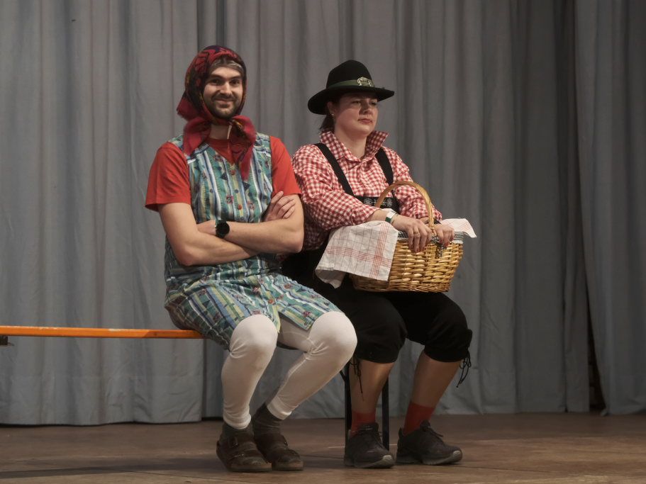 Auch der nächste Sketch spielte in der Kirche: Sonja Münsch und Andreas Humm beschrieben den sonntäglichen Kirchgang eines Ehepaares, frei nach dem Motto „Sehen und gesehen werden“. Die verpeilte Ehefrau trug noch ihre Gummistiefel und zu Hause brutzelte das Gesangbuch im Sauerkraut, während sie das Rauchfleischstück als Gesangbuchersatz aus ihrer Tasche zog. Was wiederum den Gatten daran erinnerte, dass es im Ort mit dem “Hirsch” noch eine Wirtschaft gibt, die sonntägliche Frühschoppengäste willkommen heißt.