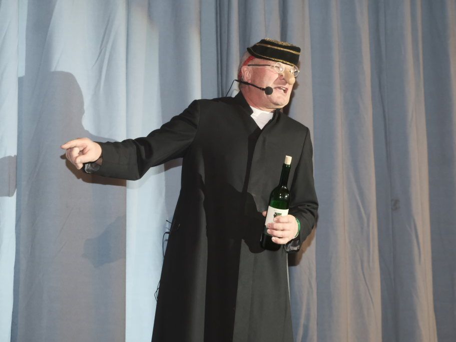 Nach einem musikalischen Zwischenspiel mit Juke-Box betrat Manfred Ruf von der Musikkapelle Unterschwarzach als sich über alles und jeden ereifernden Mesner die Szene. Ziele seines Ärgers waren neben den Messwein trinkenden Ministranten – er war ihnen da ein sehr gutes Vorbild – oder auch die angefütterten Kirchenmäuse, die wegen ihre Leibesfülle beinahe nicht mehr durch ihre Löcher kamen. Auch die beiden Kollegen in Unterschwarzach waren Ziel seines Ärgers, weil sie immer so ruhig blieben, ebenso sein Pfarrer, der kein Wasser mochte und dem er stattdessen bei der Wandlung Schnaps kredenzen musste.