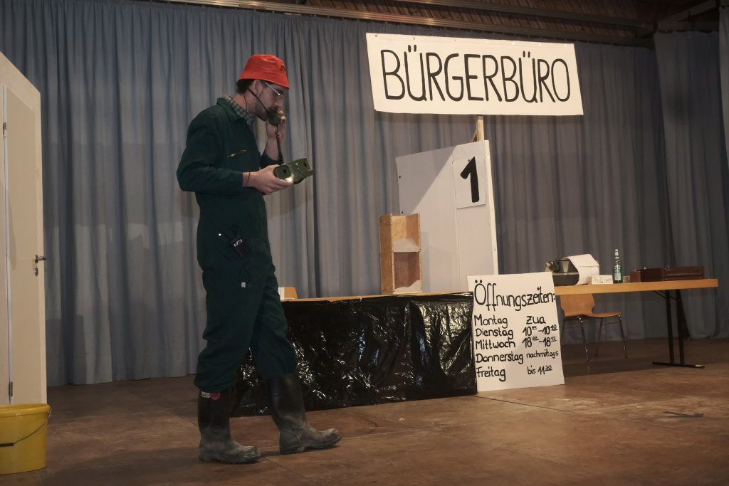 Das (noch fiktive) Bürgerbüro nahm beim Ball schon mal den Probebetrieb auf: v.l. Bauer Maximilian Merk, Beamter Herr Bert (Christian Wiest) und Gemeindearbeiter Stefan Niedermaier