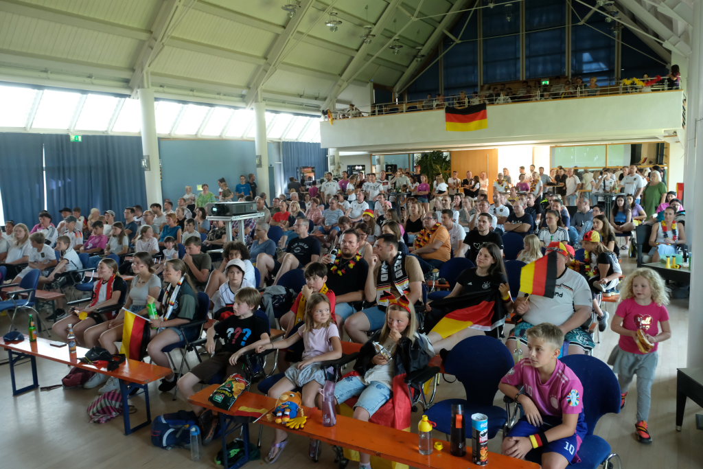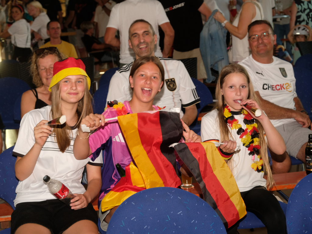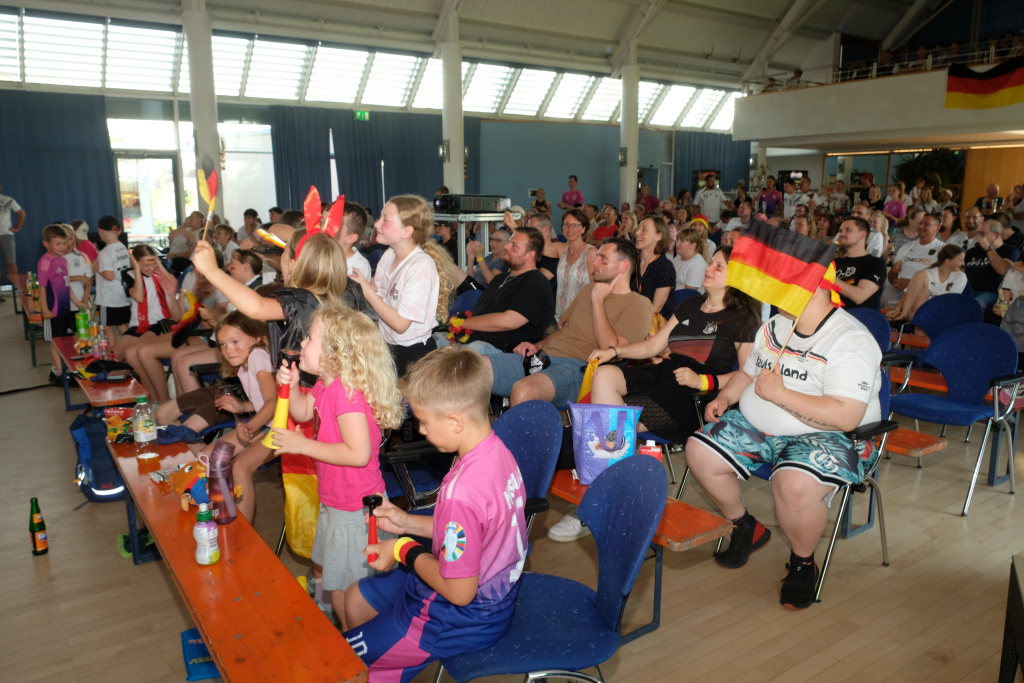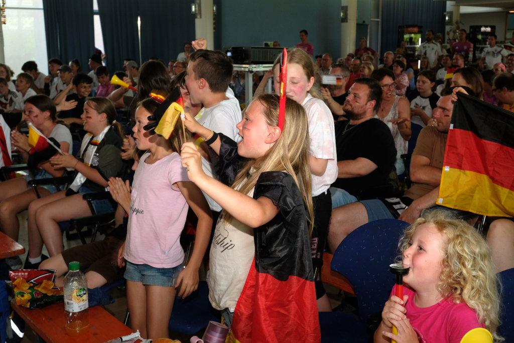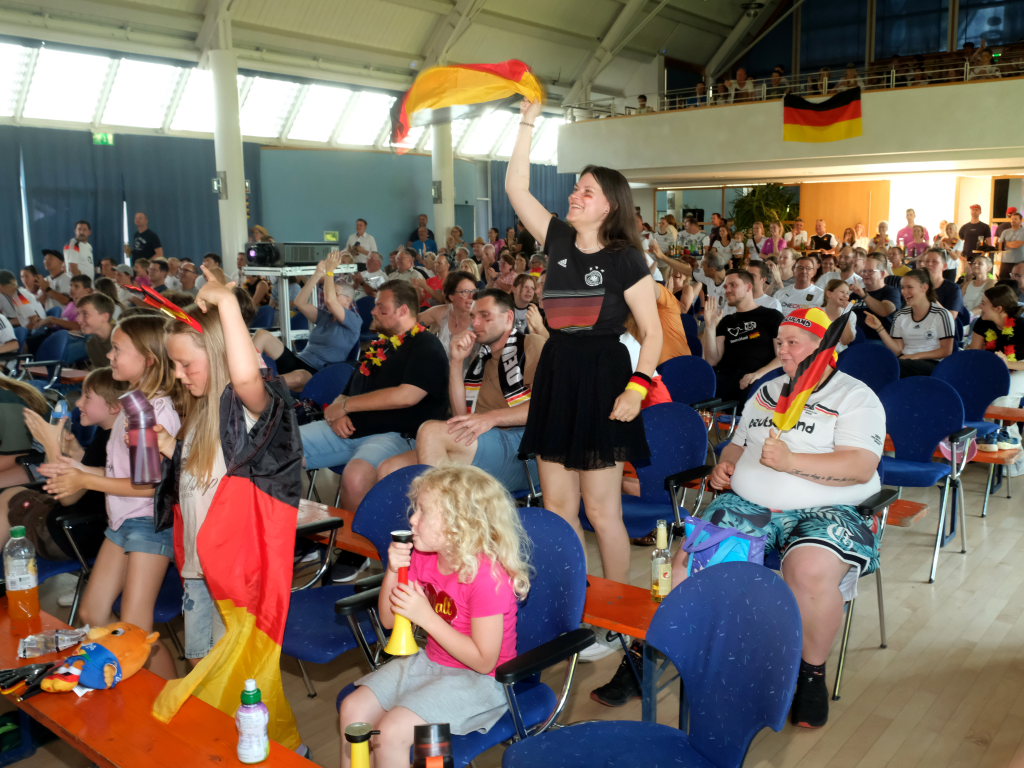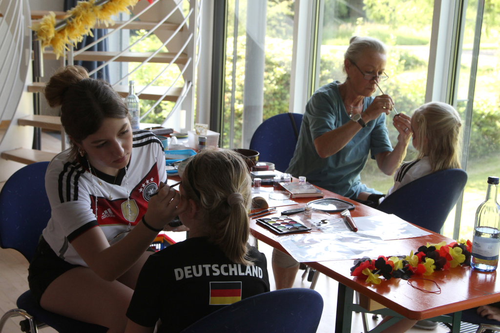 Und weil dieses Mal der Anpfiff bereits um 18.00 Uhr war, wurde das Spiel mit Public-Viewing zu einem großen Familienfest, bei dem zahlreiche Kinder durch den Saal wirbelten, nachdem sie zuvor beim Kinderschminken mit schwarzrotgoldenen Flaggen, Streifen und vielem mehr verziert worden waren.