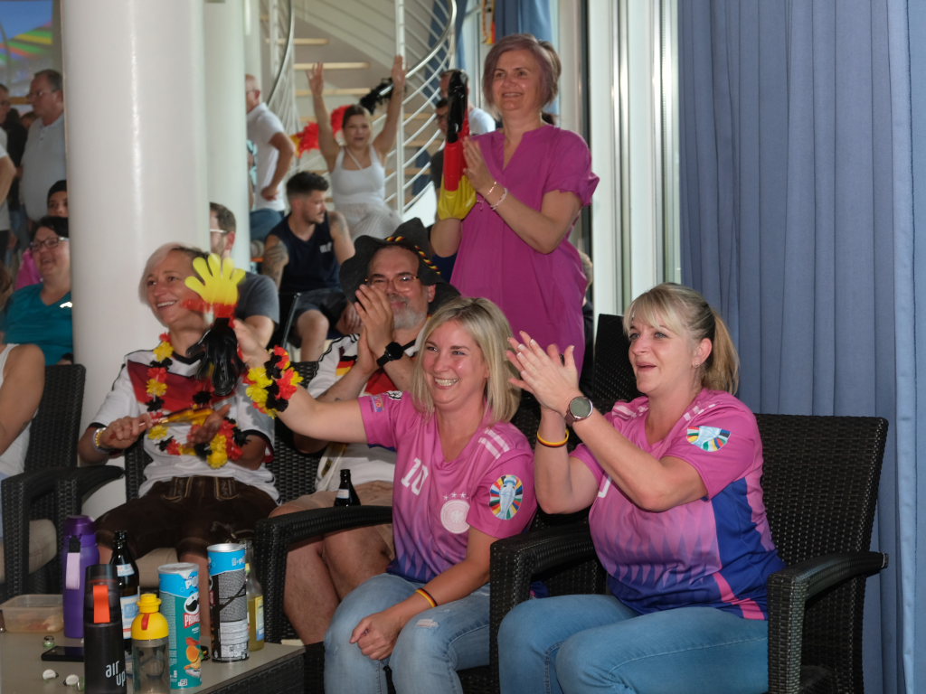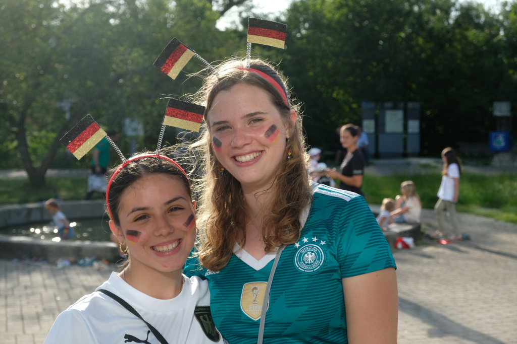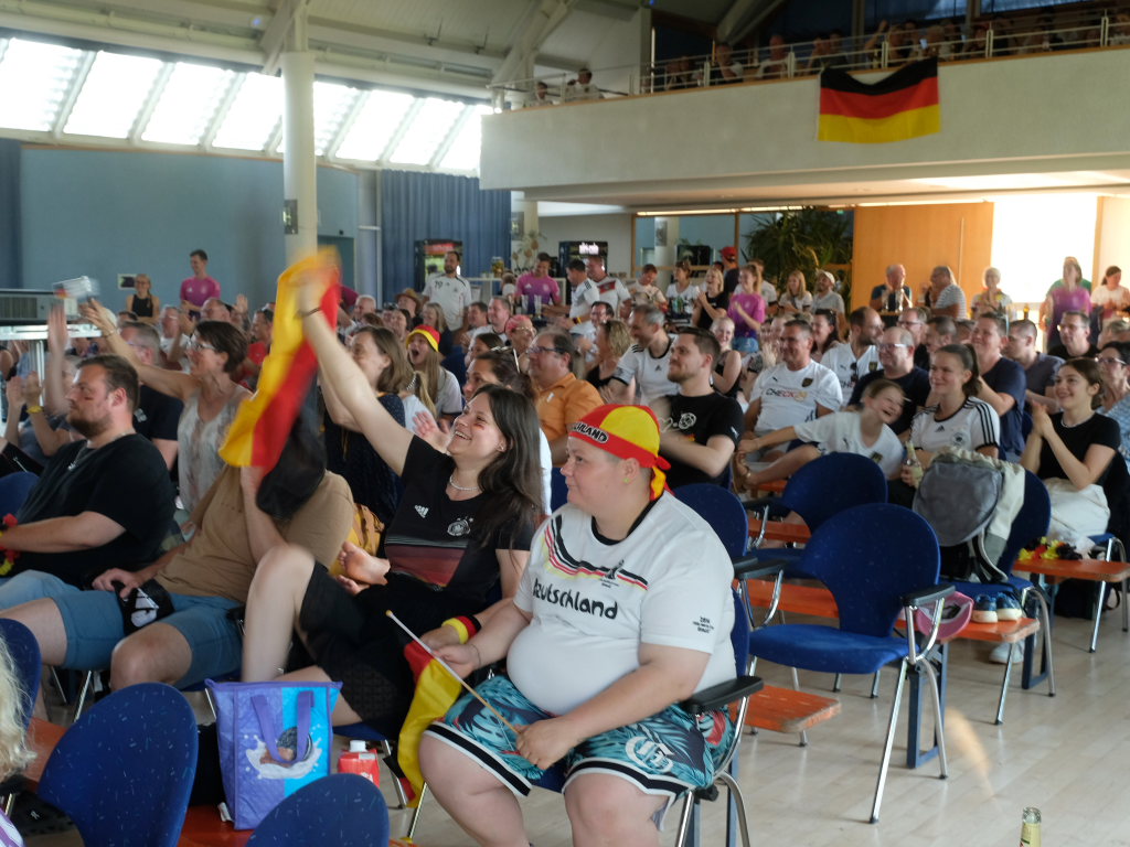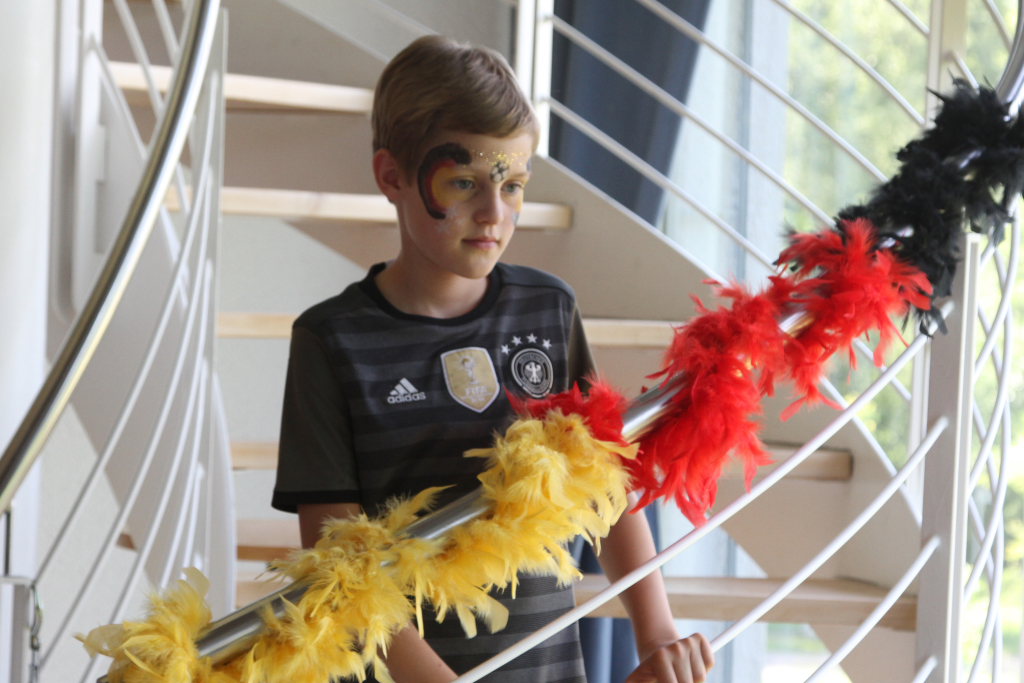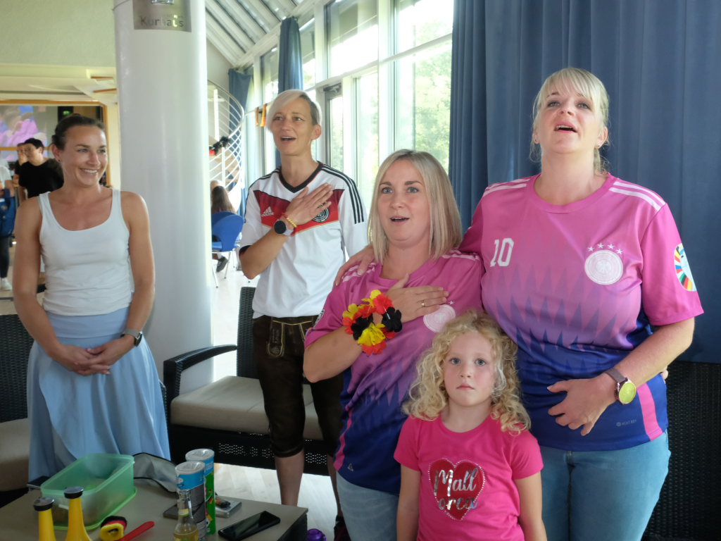 Und weil dieses Mal der Anpfiff bereits um 18.00 Uhr war, wurde das Spiel mit Public-Viewing zu einem großen Familienfest, bei dem zahlreiche Kinder durch den Saal wirbelten, nachdem sie zuvor beim Kinderschminken mit schwarzrotgoldenen Flaggen, Streifen und vielem mehr verziert worden waren.