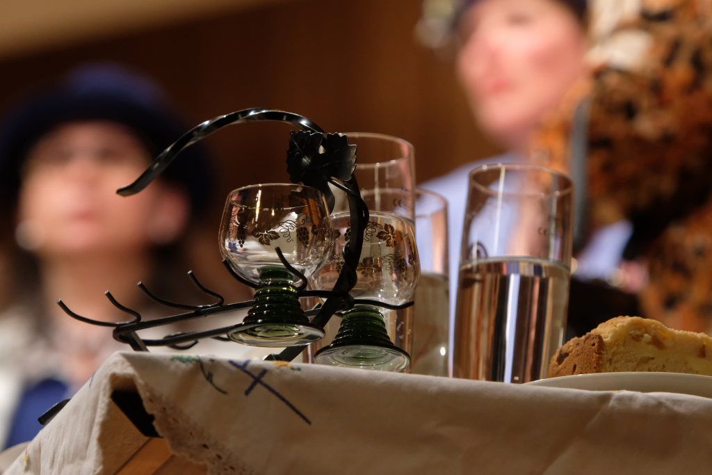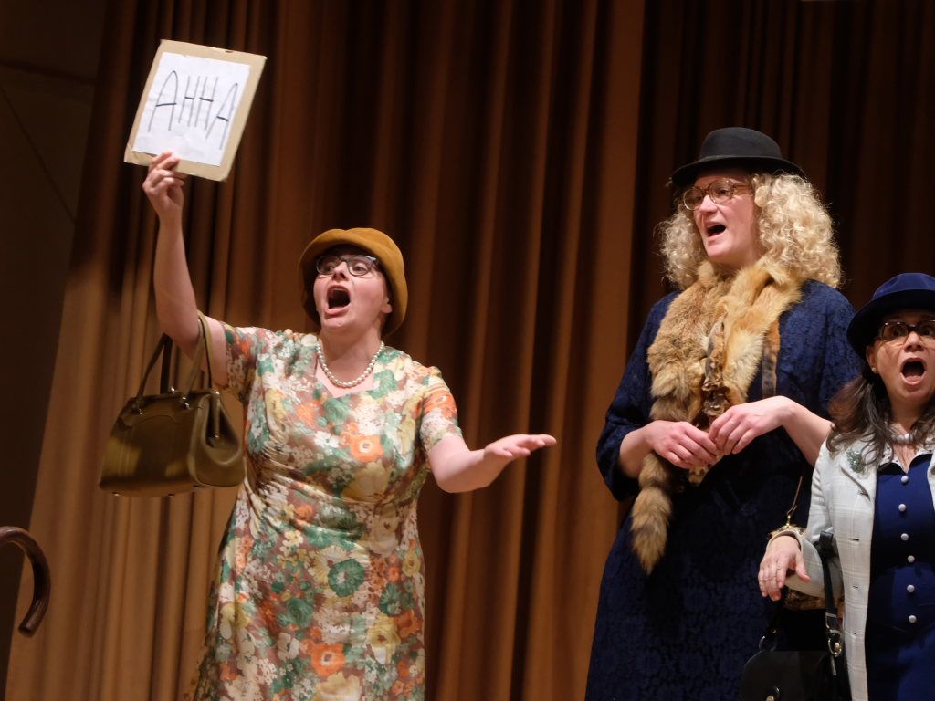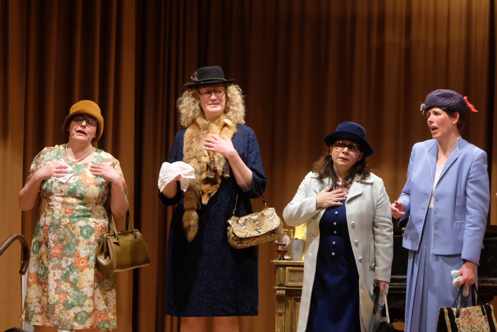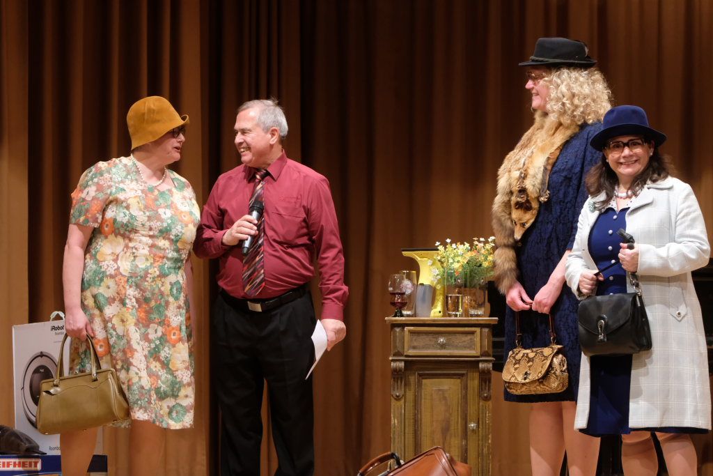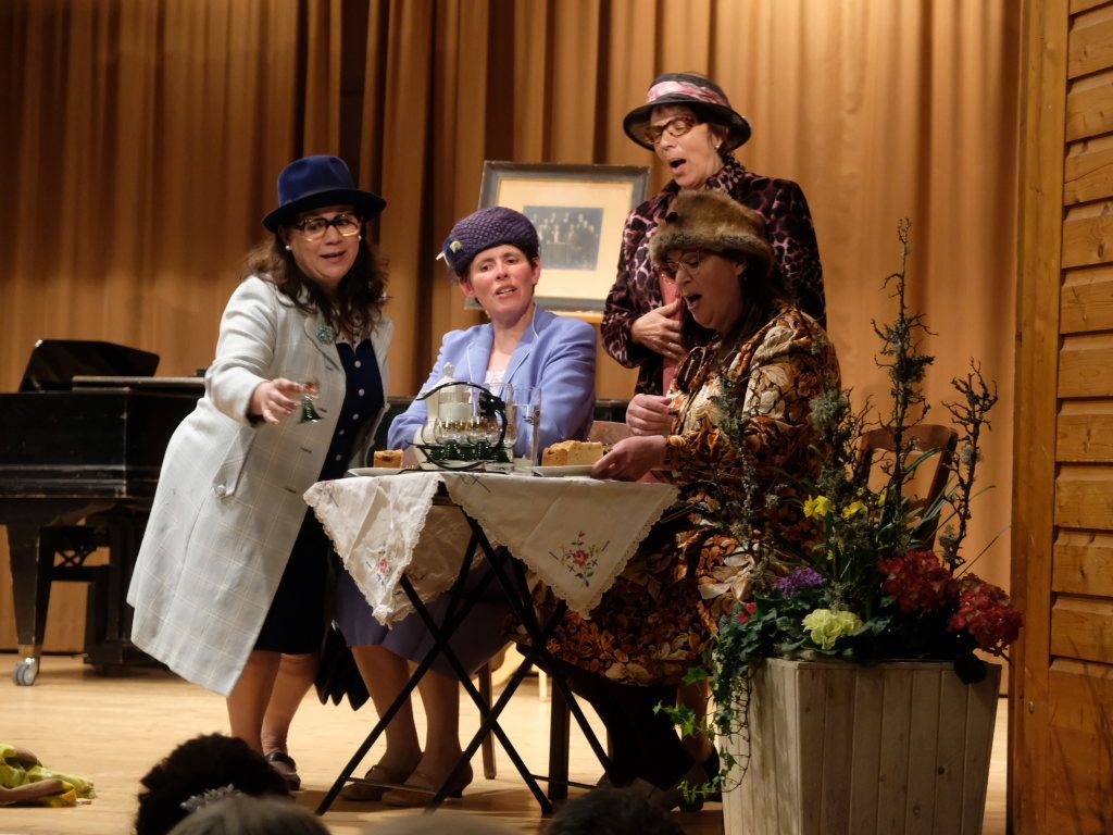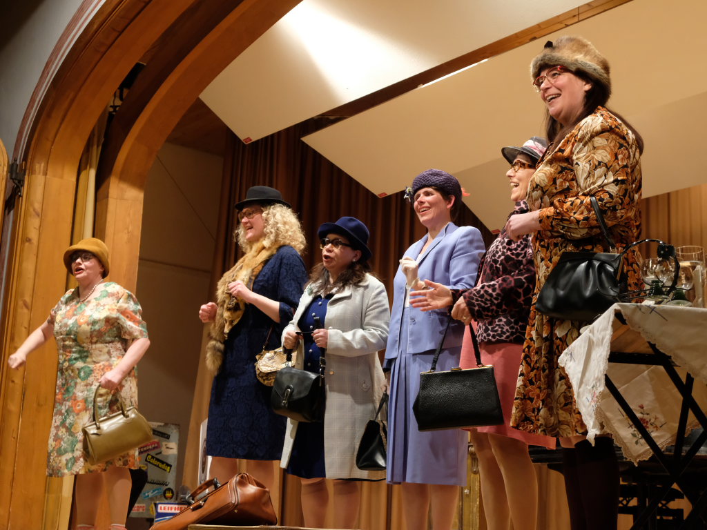 Bei Halba Drui ist eigentlich nichts, wie es zu sein scheint. Die „alten“ Damen sind im wirklichen Leben eine Generation jünger als ihre Bühnenpräsenz. Und anstelle von Kaffee rinnt Rotwein durch den Schwanenhals der Kaffeekanne des Porzellan-Services beim Kaffeekränzchen. Und die kleinen Römer-Weingläser stammen aus der Zeit, als die auf der Bühne dargestellten Damen noch jung waren. Gerne nahmen die sechs Damen aus Unteropfingen, die aufgrund mehrerer legendärer Auftritte beim A-Cappella-Abend des Kirchenchors Ziegelbach hierzulande keine Unbekannten sind, die Steilvorlage an, die die Mannen um Peter Schad ihnen mit ihrem letzten Lied geliefert hatten.