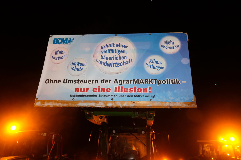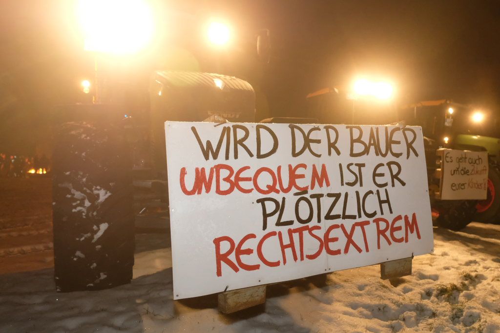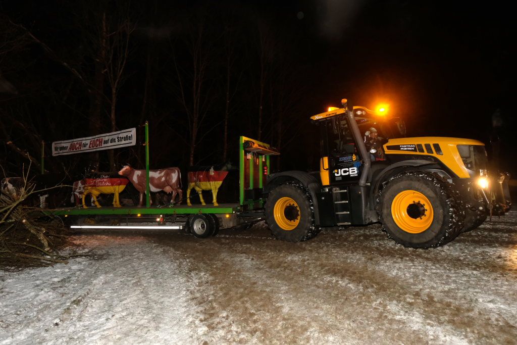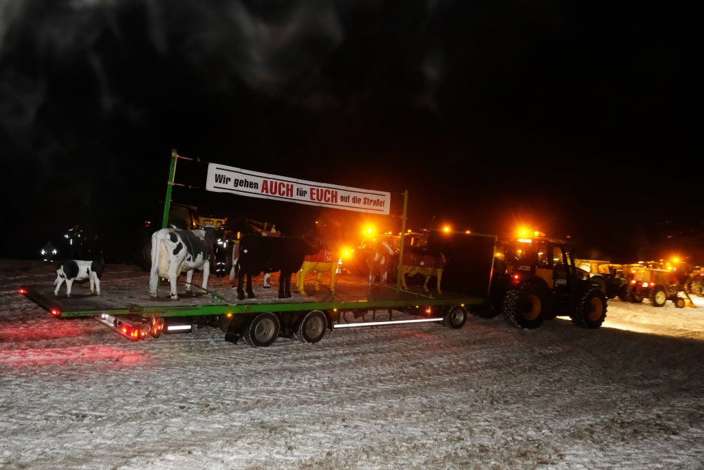 Den Vogel aber schoss ein Teilnehmer ab, der auf seinem Anhänger einige Plastik-Protestkühe spazierenfuhr unter dem Transparent mit dem Text: „Wir gehen auch für Euch auf die Straße!“ Weiter hieß es auf dem Plakat: „Ohne Landwirtschaft wärst du hungrig & nüchtern. Unsere Zeit läuft ab – Eure Last auf unsren Schultern –das tragen wir nicht mehr. Die Ampel sät und erntet nicht. Flächendiebstahl und Bürokratie, wo bleiben wir? Tierwohl, Umweltschutz, Erhalt einer vielfältigen, bäuerlichen Landwirtschaft, mehr Biodiversität, Klimaleistungen – ohne Umsteuern der Agrarmarktpolitik nur eine Illusion.” Aber auch: „Unser Land sucht qualifizierte Führungskräfte. Leute ohne Ahnung wollen uns ruinieren, deshalb fahren wir demonstrieren. “