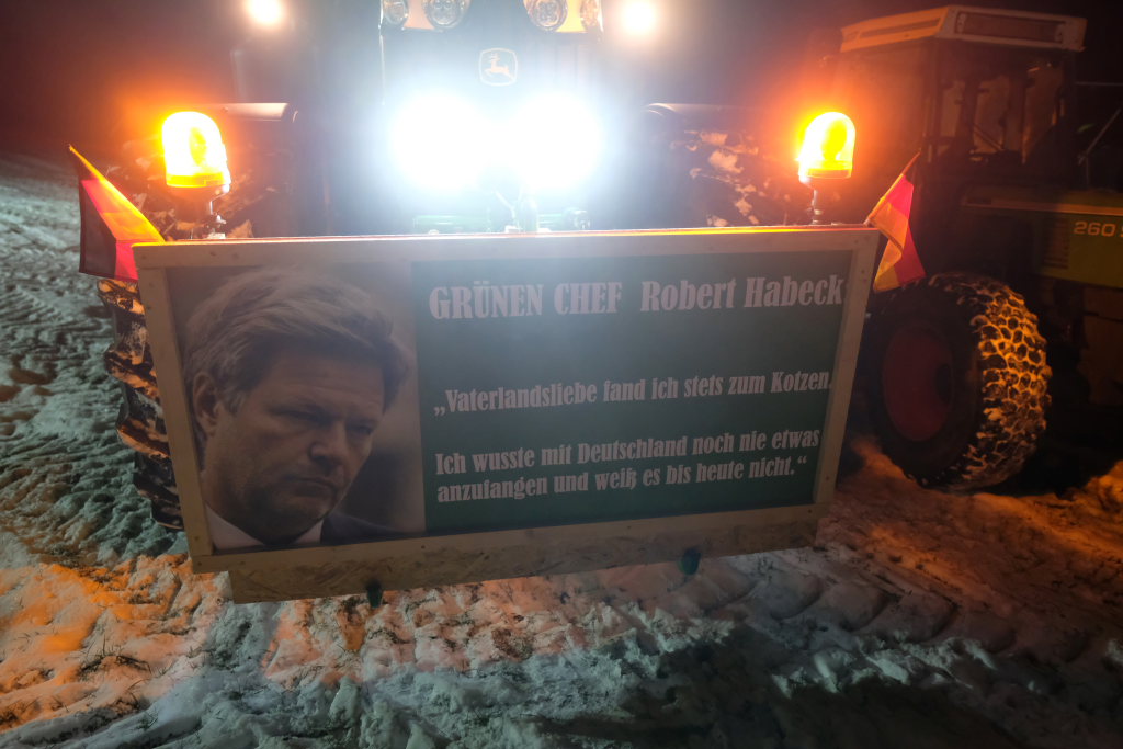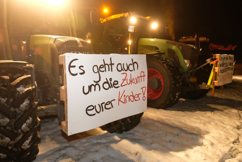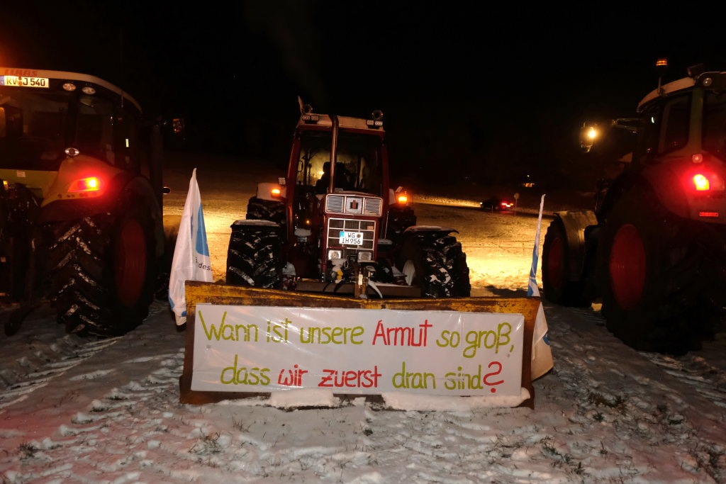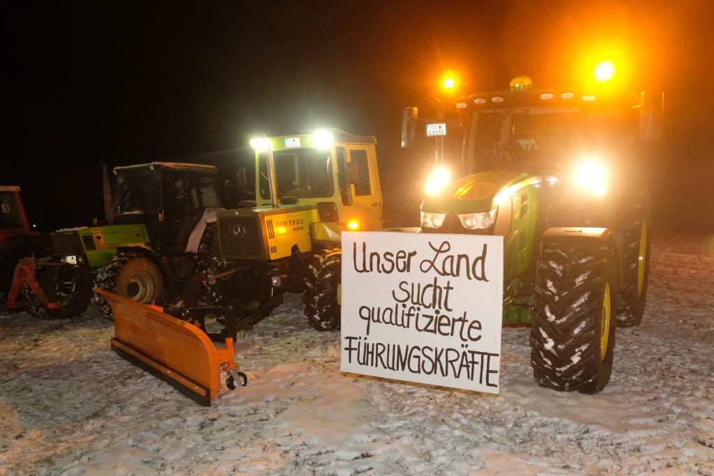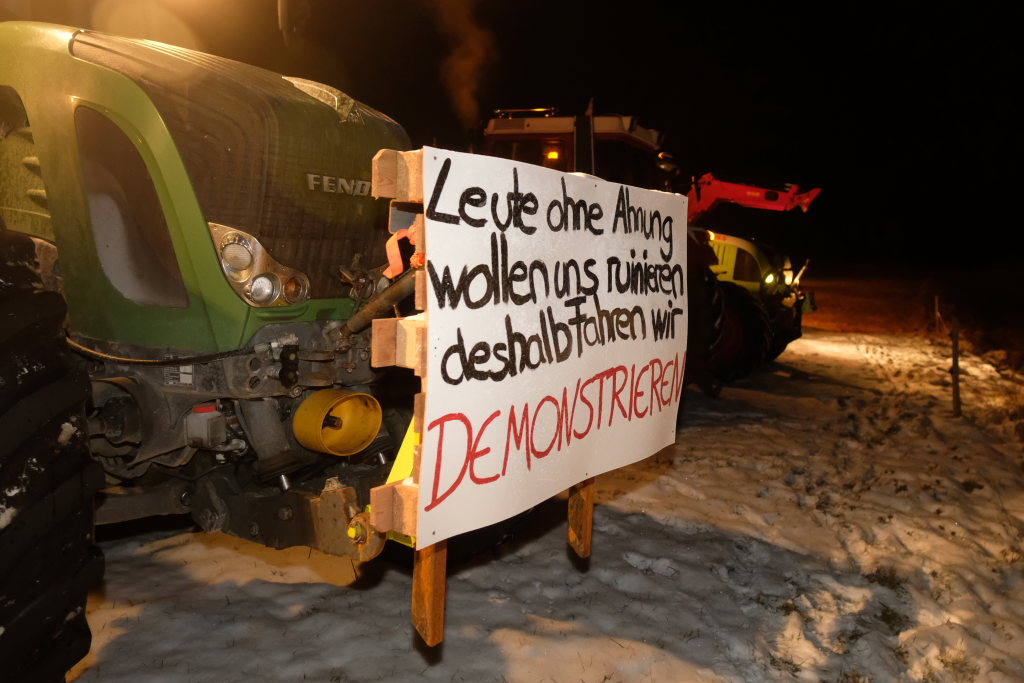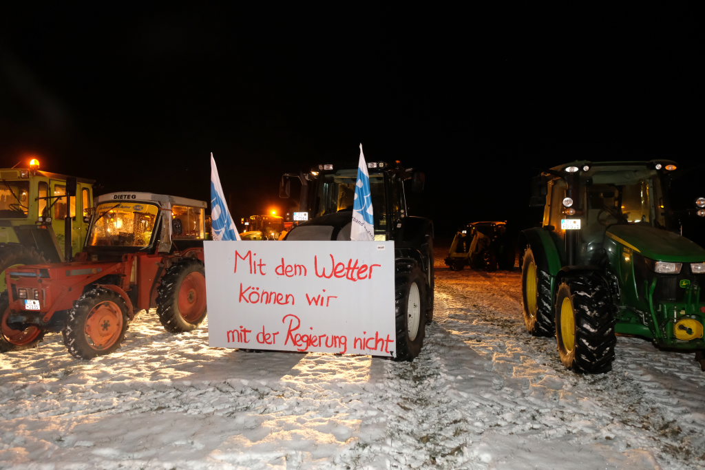 Aber auch zahlreiche Wurzacher pilgerten aus der Stadt herauf, darunter Bürgermeisterin Alexandra Scherer. Am Ende standen rund 100 Traktoren jeglicher Größe auf der im Sommer als Viehweide dienenden schneebedeckten Wiese. Viele von ihnen waren mit Transparenten und Plakaten ausgestattet, mit denen die Landwirte ihren Protest gegen die Politik, vor allem gegenüber der Berliner Ampel-Koalition, zum Ausdruck brachten.