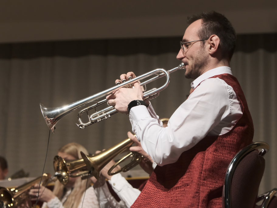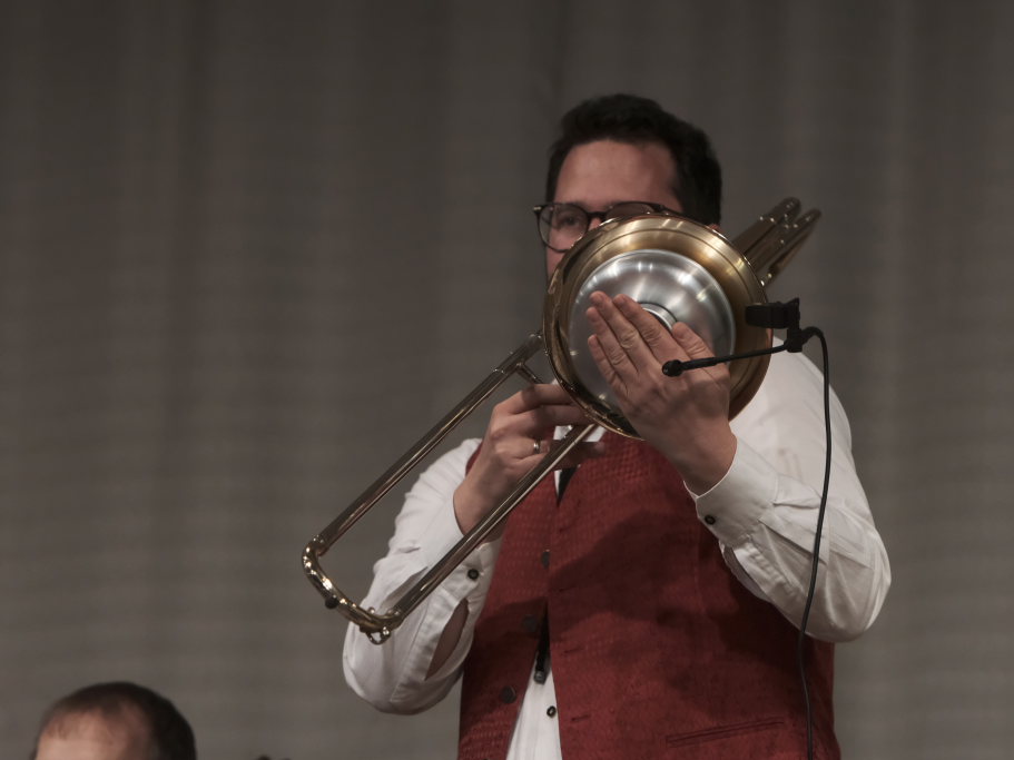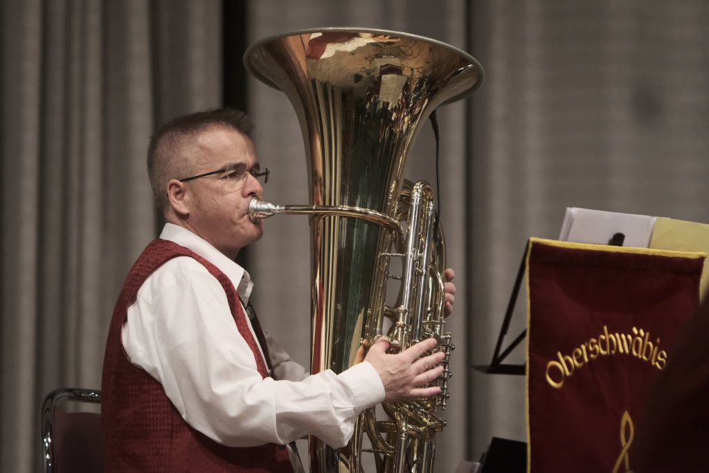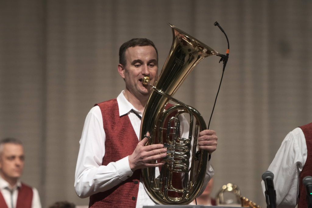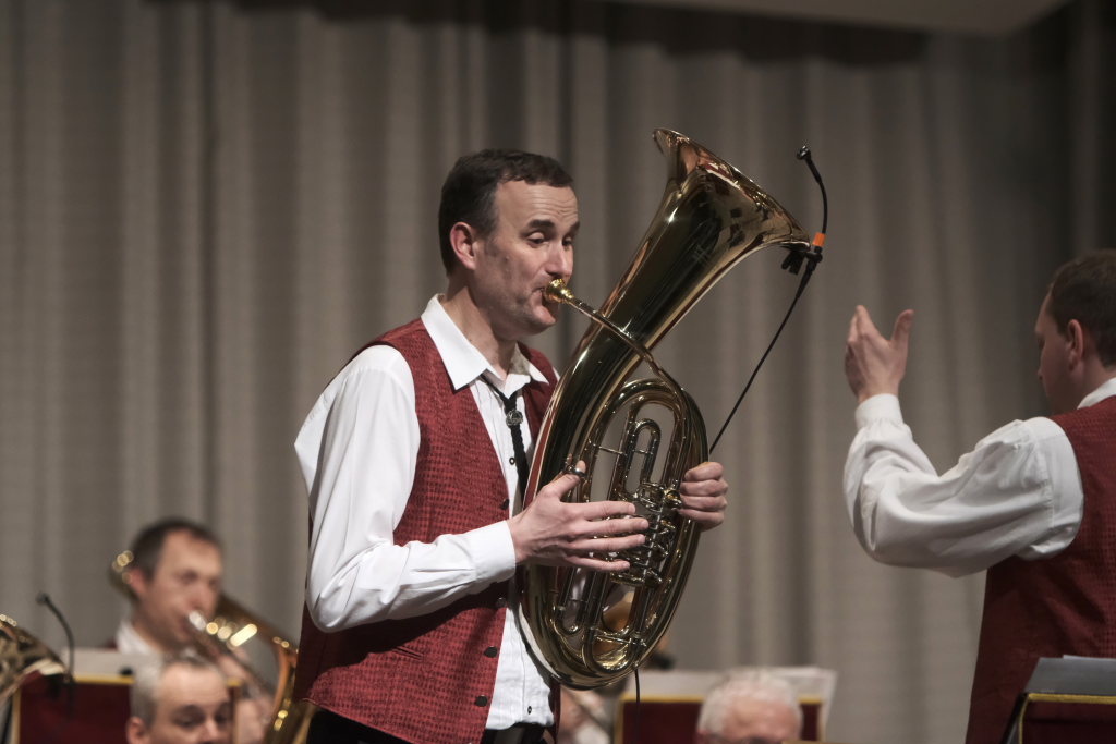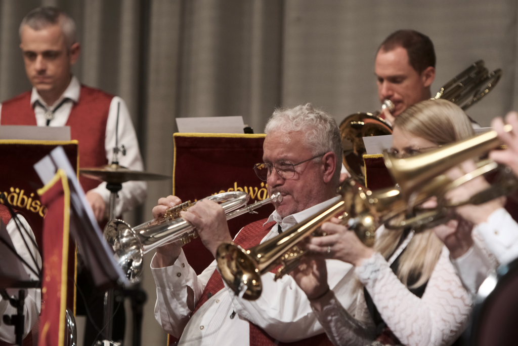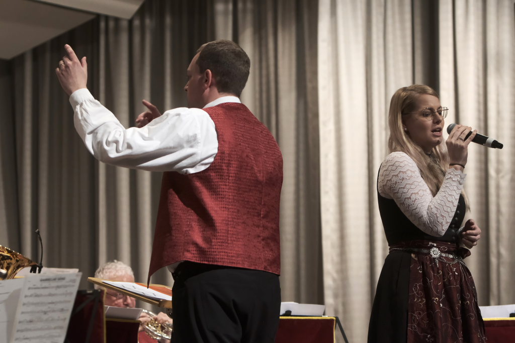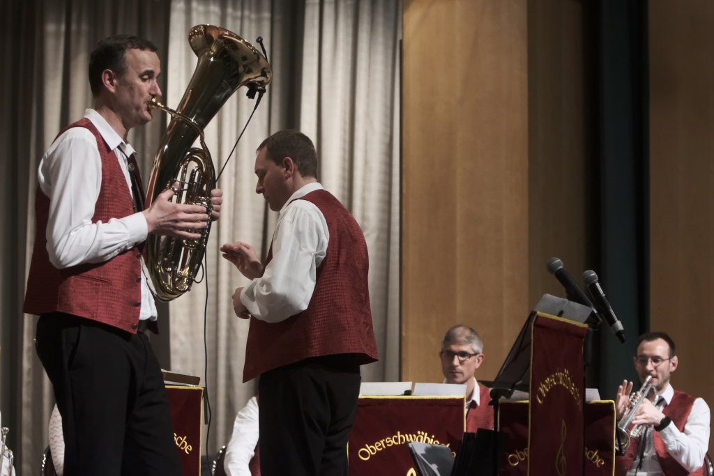 Mit der beliebtesten Polka aus der Feder von Peter Schad mit dem bezeichnenden Titel „Ewig Schad“ waren Musiker und Publikum schon mitten im Konzertmodus. Als Carina danach den Lebenslauf des Dirigenten nachzeichnete, stellte sie viele Parallellen zwischen den beiden fest: Aufgewachsen in einem kleinen Ort bei Biberach, sammelten beide als Posaunisten Bühnenerfahrungen beim Heeresmusikkorps in Ulm (O-Ton Kienle: „für beides kann er nichts!“) und beide studierten Musik auf Lehramt. Föhr ist Studienrat für Mathe und Musik am Gymnasium in Ehingen und als Diplom-Dirigent Leiter der Stadtkapelle Biberach.