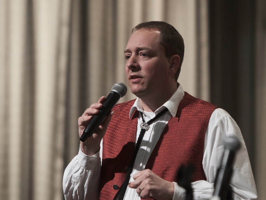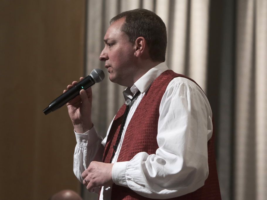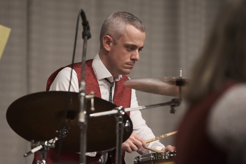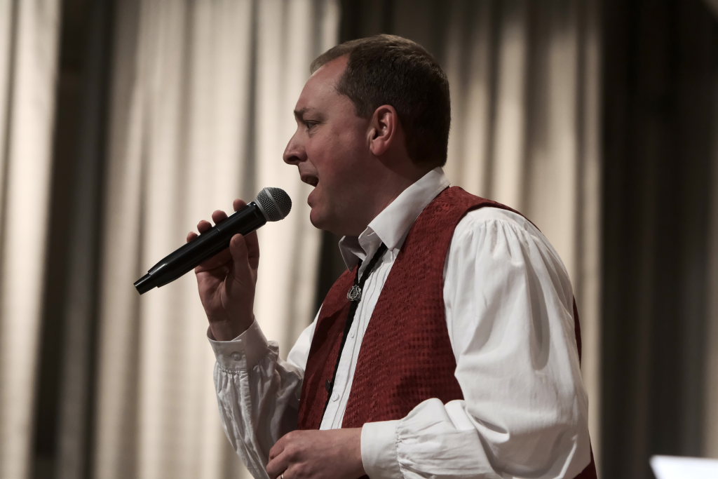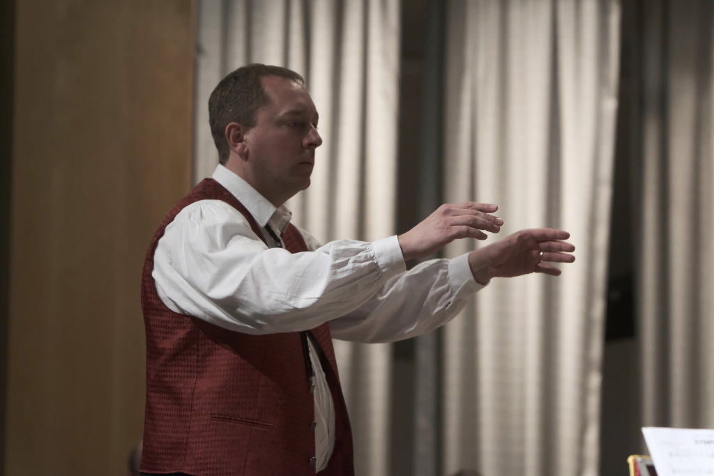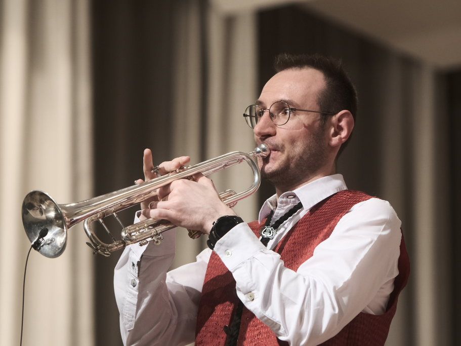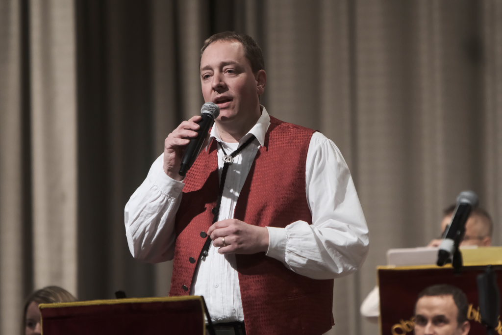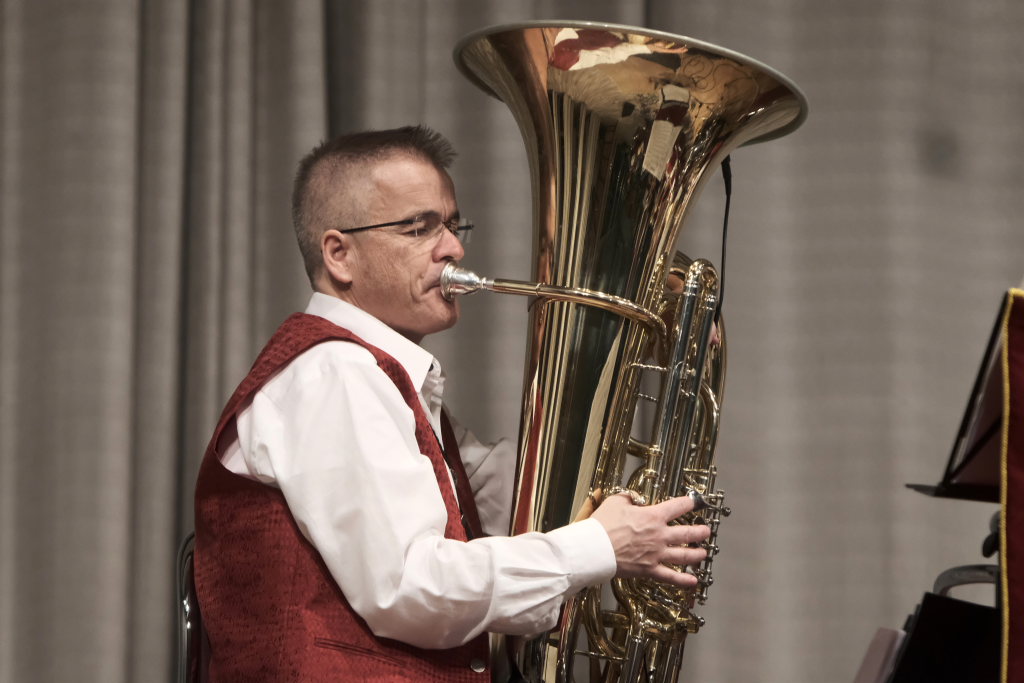Mit der beliebtesten Polka aus der Feder von Peter Schad mit dem bezeichnenden Titel „Ewig Schad“ waren Musiker und Publikum schon mitten im Konzertmodus. Als Carina danach den Lebenslauf des Dirigenten nachzeichnete, stellte sie viele Parallellen zwischen den beiden fest: Aufgewachsen in einem kleinen Ort bei Biberach, sammelten beide als Posaunisten Bühnenerfahrungen beim Heeresmusikkorps in Ulm (O-Ton Kienle: „für beides kann er nichts!“) und beide studierten Musik auf Lehramt. Föhr ist Studienrat für Mathe und Musik am Gymnasium in Ehingen und als Diplom-Dirigent Leiter der Stadtkapelle Biberach.