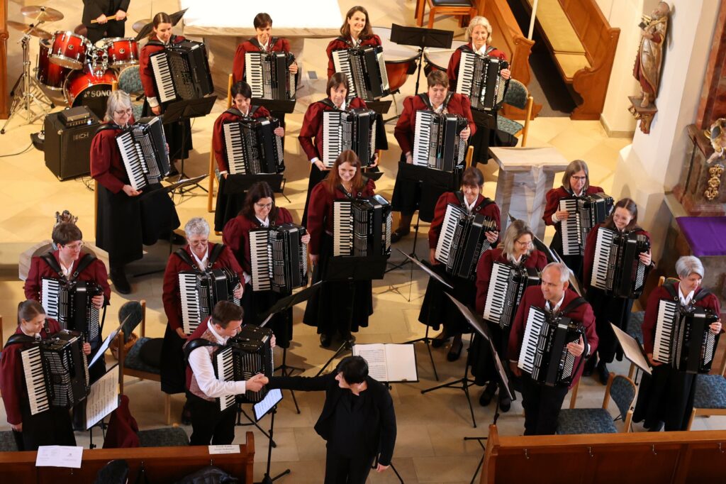 Ursula Glöggler-Sproll, Dirigentin des Akkordeonspielkreises Mettenberg, grüßt zur Empore, von wo Benedikt Bago an der Orgel und Stephan Bago jun. als Sänger beim Konzert mitwrkten.