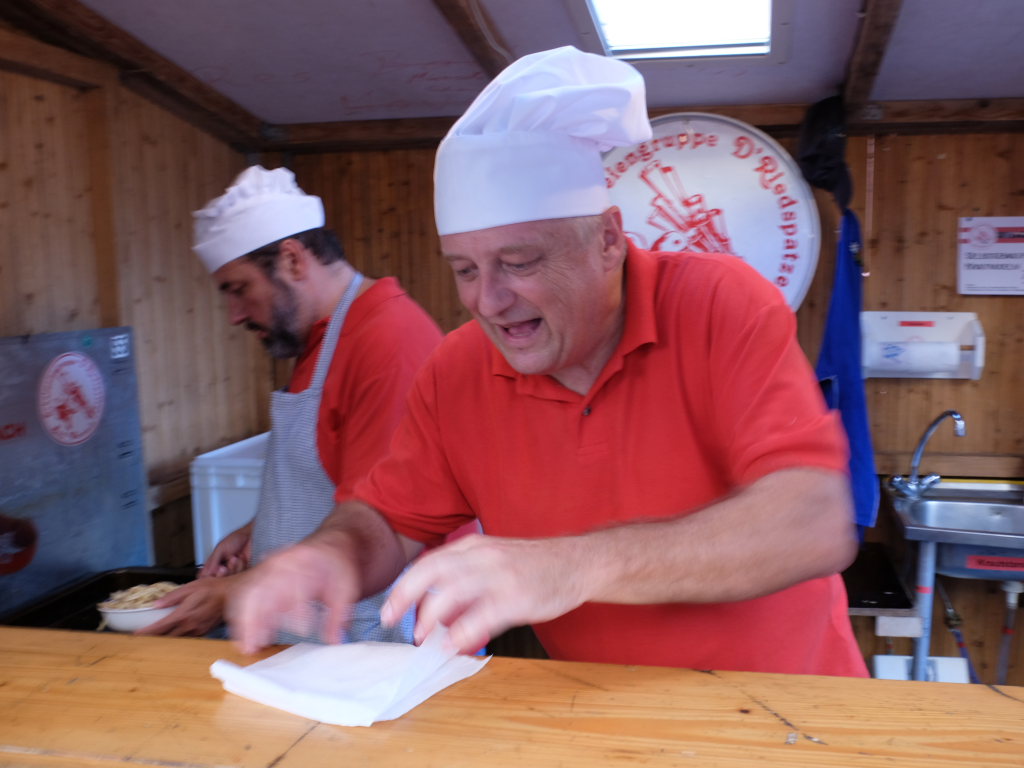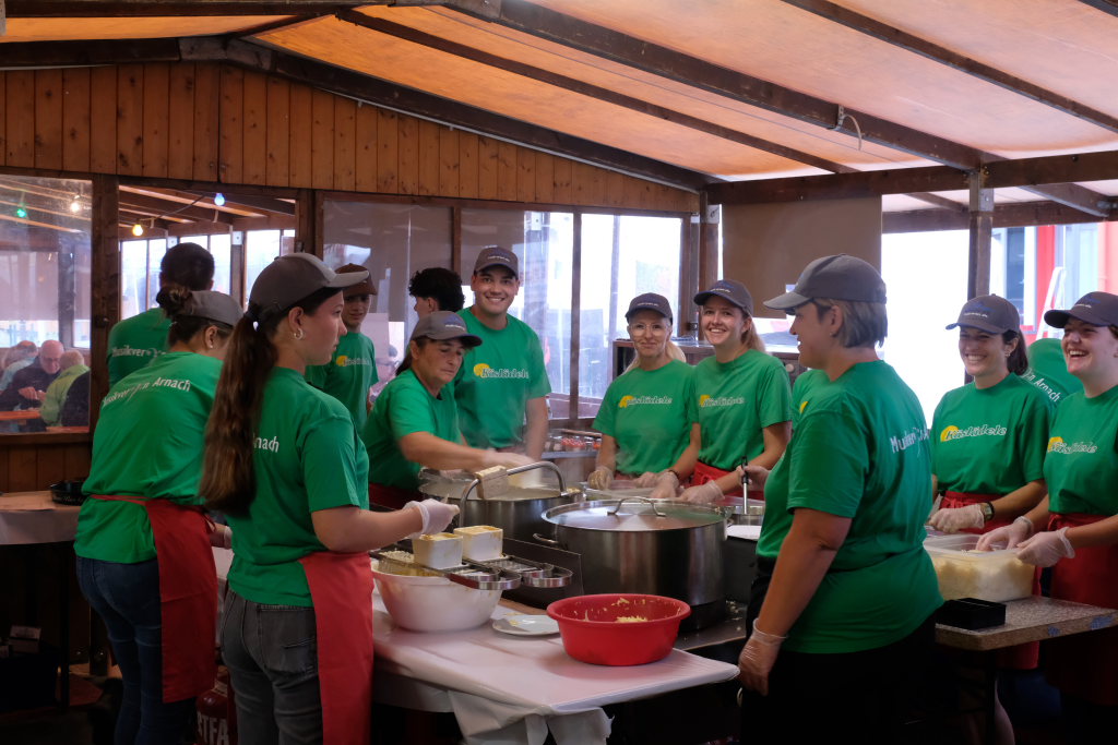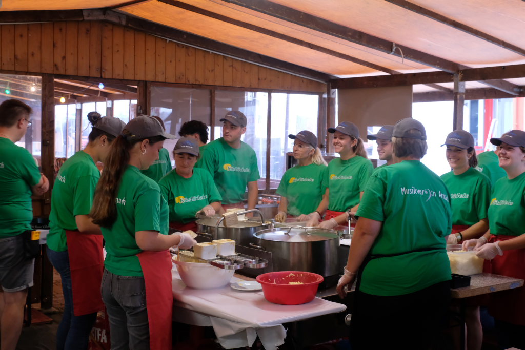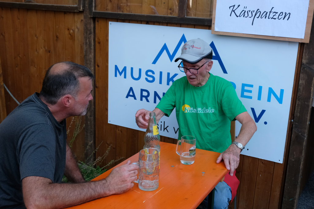 Die Arnacher drehten in ihrer Kässpatzen-Hütte den Spieß um: Während die Gäste die wohl berühmteste Spezialität des Stadtfestes genossen, spielte eine kleine Besetzung des Musikvereines zur Unterhaltung auf.