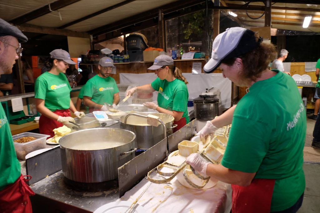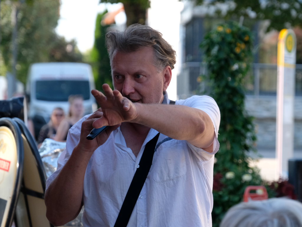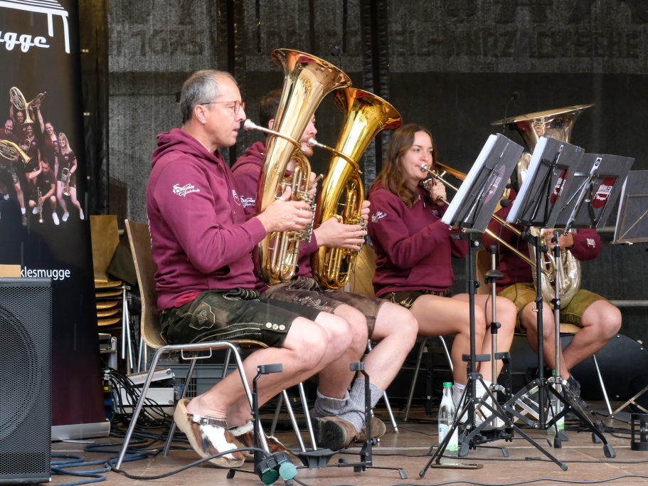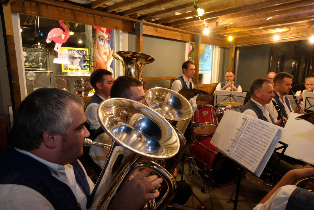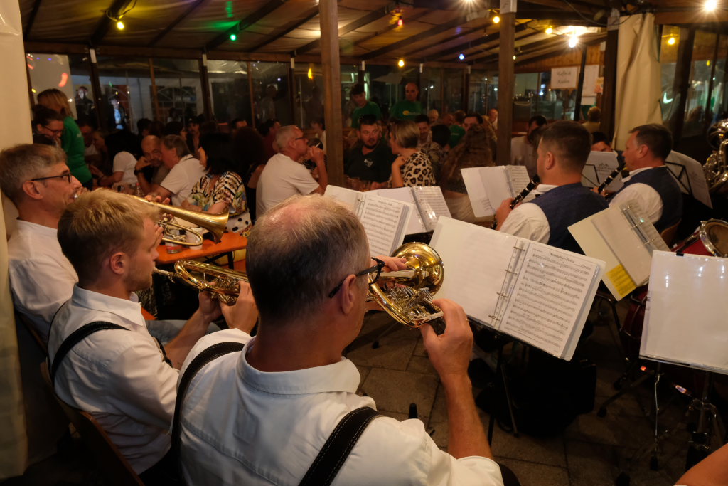 Die Arnacher drehten in ihrer Kässpatzen-Hütte den Spieß um: Während die Gäste die wohl berühmteste Spezialität des Stadtfestes genossen, spielte eine kleine Besetzung des Musikvereines zur Unterhaltung auf.