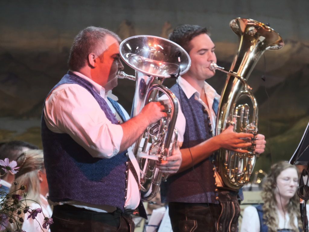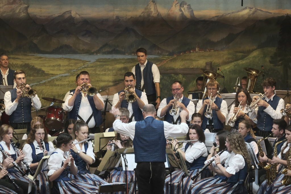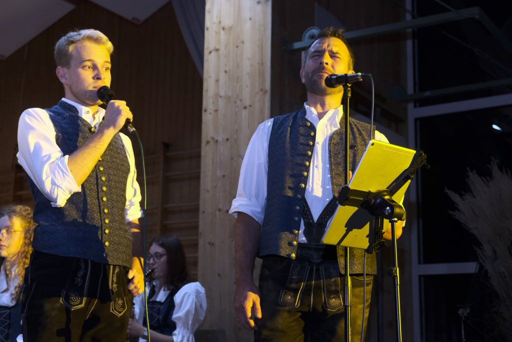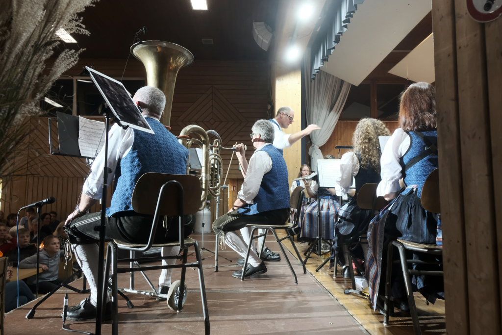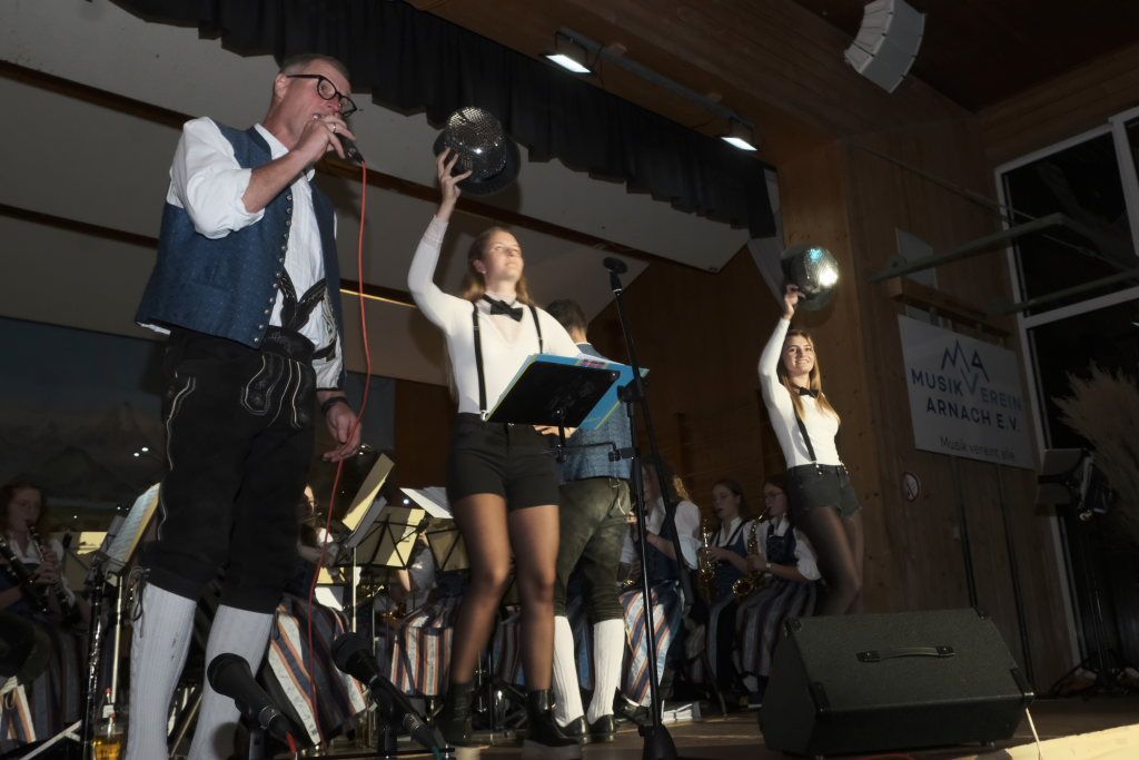 Mit dem flotten Marsch „Die Sonne geht auf“ und verschiedenen Polkas stiegen die Musikanten in den Abend ein, nachdem Steffi Jöchle vom Vorstandsteam die Begrüßung übernommen hatte. Sie freute sich dabei besonders, dass so viele Vertreter anderer Musikkapellen aus der Region den Weg nach Arnach gefunden hatten. Nach der Ernst Mosch-Polka “Rauschende Birken” durften sich die Baritone der Kapelle, Alexander Müller und Martin Fimpel, ansonsten immer weit hinten platziert, mit dem Solo „Baritone in der Nacht“ einmal ins Rampenlicht schieben.