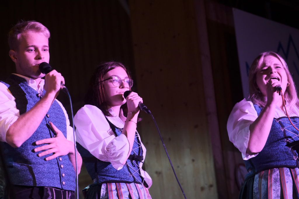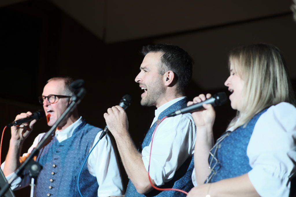 Neues von den “Fehlaperlen” brachte der Mädel- Gesang mit „Sapperlott“ auf die Arnacher Show-Bühne, das sie den Ratsch-Weibern des Ortes widmeten. Etwas ganz Besonderes war dann der Auftritt von Maxi Hiemer, seinem Vater Berthold und Stefan Braun mit „Ham kummst“ von Sailer & Speer. Das Lied hatte der junge Mann nach Gehör (!) für die Musikkapelle arrangiert und trug es mit großer Intensität vor.