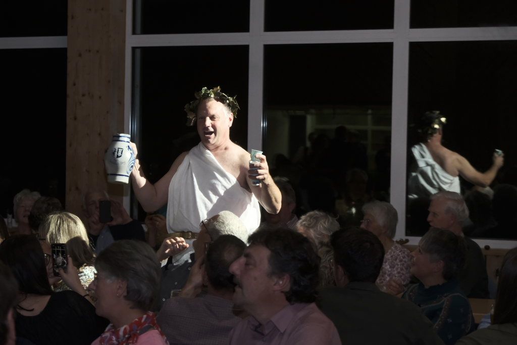 Den skurrilsten Auftritt legten Gerhard Längst und Alex Maier mit der von Reinhold Buffler konstruierten Tuba für zwei kurz nach der Pause hin. Beim großen Udo-JürgensMedley sang die ganze Halle mit, wie bei „Aber bitte mit Sahne“ oder „Mit 66 Jahren“. Beim “Griechischen Wein” traten tatsächlich drei männliche Weingötter mit lorbeerumkränzten Häuptern unters Volk und schenkten aus kleinen Amphoren roten Wein aus. Nahtlos ging es bei „Ich war noch niemals in New York“ in das jazzig-swingende und mit zwei Kabarett-Tänzerinnen garnierte „New York, New York“ über.