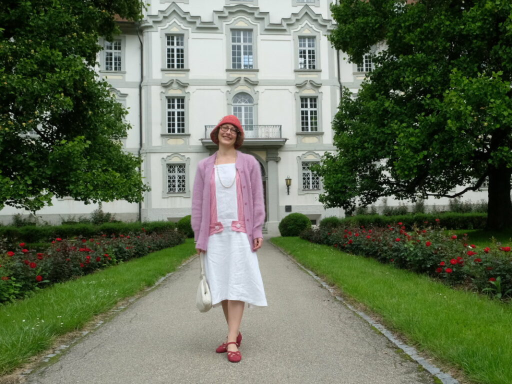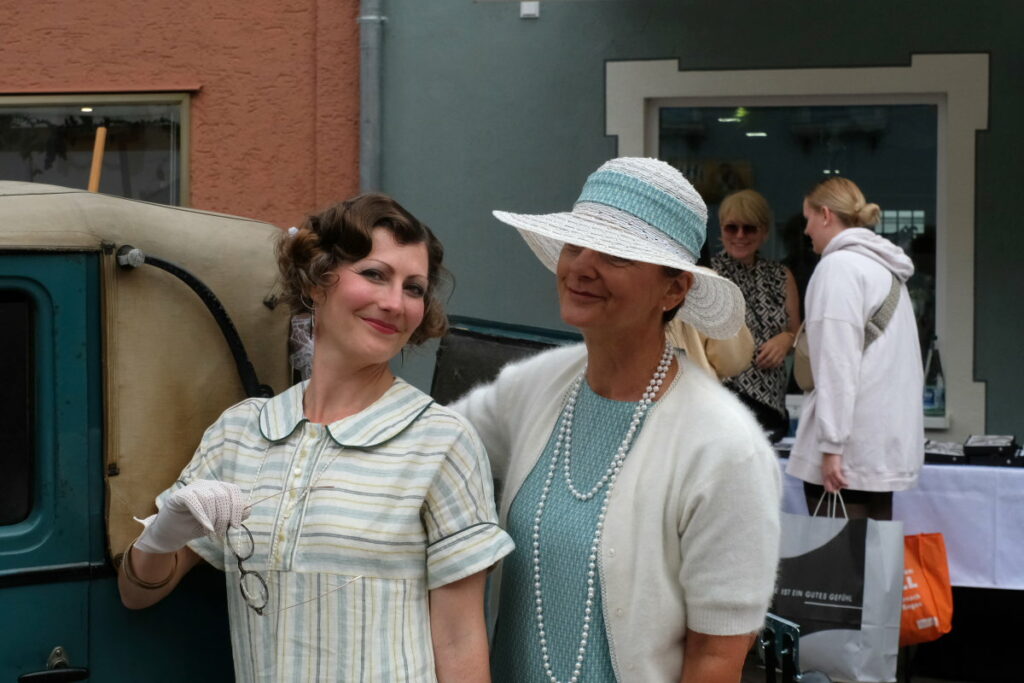 Vor einigen Jahren war sie Gründungsmitglied des Nähzirkels in der Riedstadt. Sehr dankbar ist sie, dass der Schulleiter des Salvatorkollegs, Klaus Amann, dem Nähzirkel eine Bleibe gegeben hat. Weil Nicole Schmitz-Bernt so gerne im Vintage-Stil schneidert, war dieser auch Inhalt eines kleinen Motto-Näh-Wettbewerbes des Zirkels. Mit dem Ergebnis, dass die Damen beim Geschichtival im vergangenen Oktober vor dem Geschäft von Optik Blickfang – gemeinsam mit den Oldtimern von Karl Ehrmann – zu eben einem solchen Blickfang wurden. Noch heute schwärmt Nicole Schmitz-Bernt begeistert von diesem Tag.