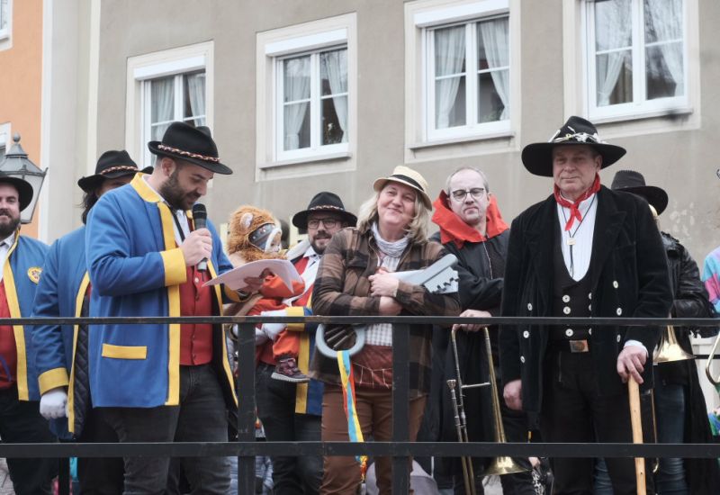 Trotz gewissen Widerstandes von Bürgermeisterin Alexandra Scherer bekamen die Narren dann doch den Rathaus-Schüssel in die Hände. Sie meinte zu dem Rathausansturm der Narren, sie hoffe, dass die Narren ausgeruht sind, „denn Arbat geit´s no grad gnug“. Schön wäre es, wenn sie in ihrer Regierungszeit bis Aschermittwoch doch gleich mal das Erdgeschoss des Herzens der Stadt sanieren würden.„Dann könnted dia Bürger wieder ins offene Hause flaniera, des wär für mi a große Freid, denn I mag um mi rum viele nette Leit.“ Photovoltaik auf allen Dächern und Flächen, in Sachen Klimaschutz würde die Stadt nun richtig Gas geben, „aber do werrat Ihr jetzt sicher neue Maßstäbe setzen.“ Mit jeder Art Erneuerbaren würde die Energiewende gelingen, nur bat sie darum, das Ried zu verschonen, um das Europa-Diplom nicht zu gefährden.